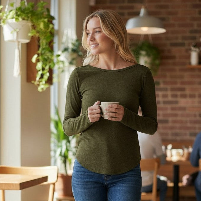 A sleek essential with a modern edge. This fitted long sleeve top features a smooth, body-hugging silhouette from the front and an unexpected open scoop back that adds just the right amount of intrigue. Designed to move with you, the soft stretch fabric offers comfort without sacrificing shape. The dark olive hue makes it endlessly wearable while still feeling elevated and intentional.