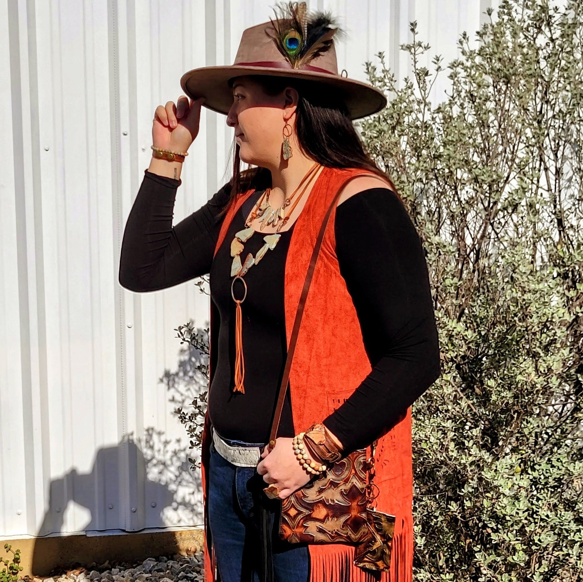 This Aqua Terra Slab Necklace is handcrafted by skilled artisans, making each piece unique. The boho design features a beautiful copper hoop and fringe tassel, adding a touch of elegance to any outfit. Enhance your style with this statement piece.