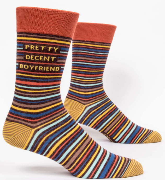 These playful crew socks are the perfect mix of comfort and personality. Designed with bold, colorful stripes and topped with a warm rust cuff, they feature the cheeky message “Pretty Decent Boyfriend” woven in for a subtle wink. Soft, stretchy, and made for all-day coziness, they’re the ideal gift for the guy who doesn’t take himself too seriously. Great for lounging, reading on a slow morning, or adding a little humor to his everyday wardrobe.