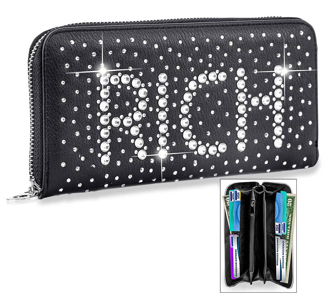 * Triple interior wallet with zip-around closure. * Interior zip divider pocket, multiple currency slots & 8 card slots. * Faux leather. * Silver hardware Approximate Size: 8L x 4H x 1W