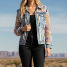 This jacket is where edge meets romance. Featuring a classic denim body paired with sheer mesh sleeves embroidered with colorful floral details, this piece blends structure and softness in the best way. Distressed accents throughout the denim add character, while the intricate embroidery brings unexpected femininity and depth.