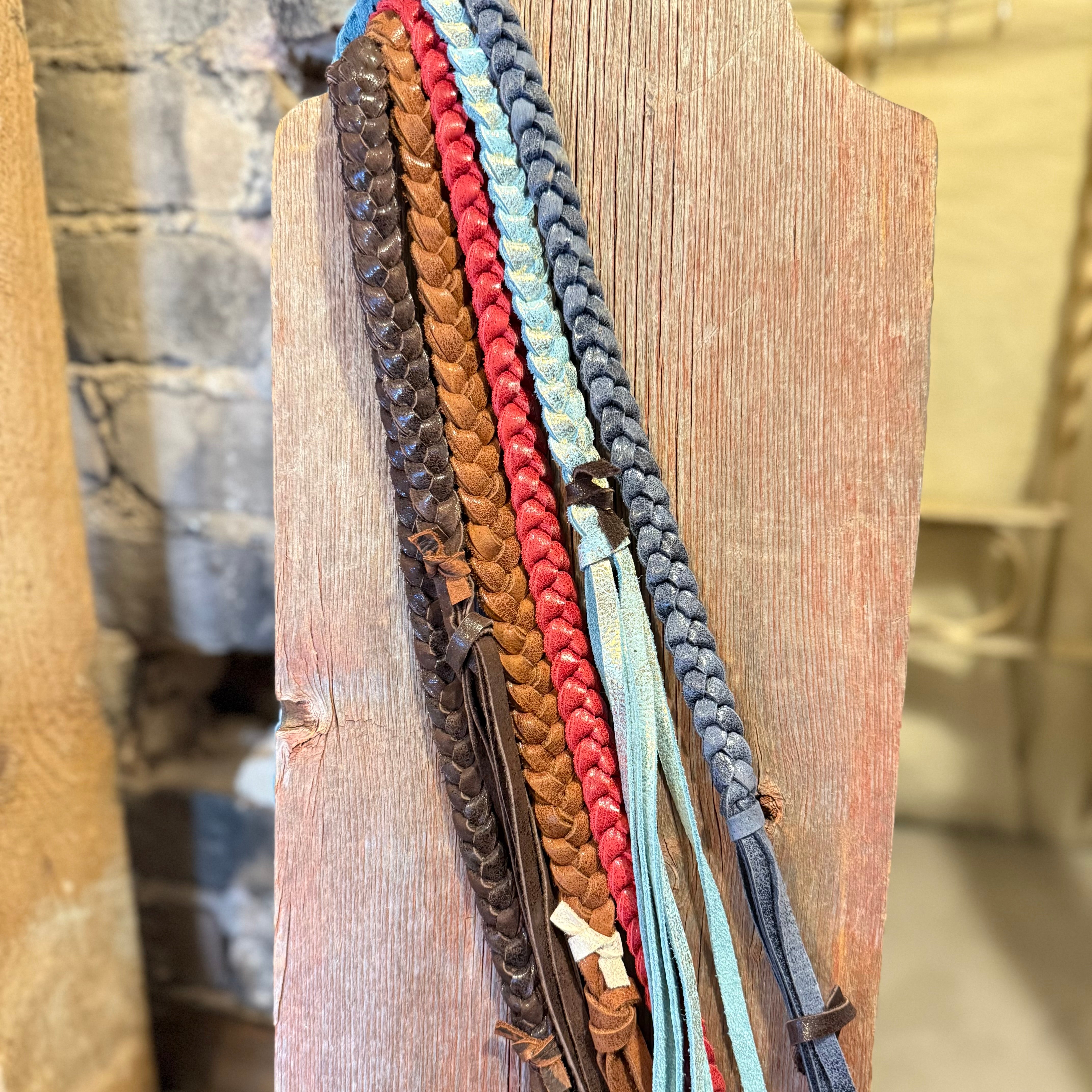 This genuine leather hat band features hand-braided leather strands finished with a subtle feather accent for an easy, lived-in western look. The mix of earthy tones and texture gives it that classic cowboy feel without being overdone. It’s lightweight, flexible, and looks just as good on a felt hat as it does on straw.