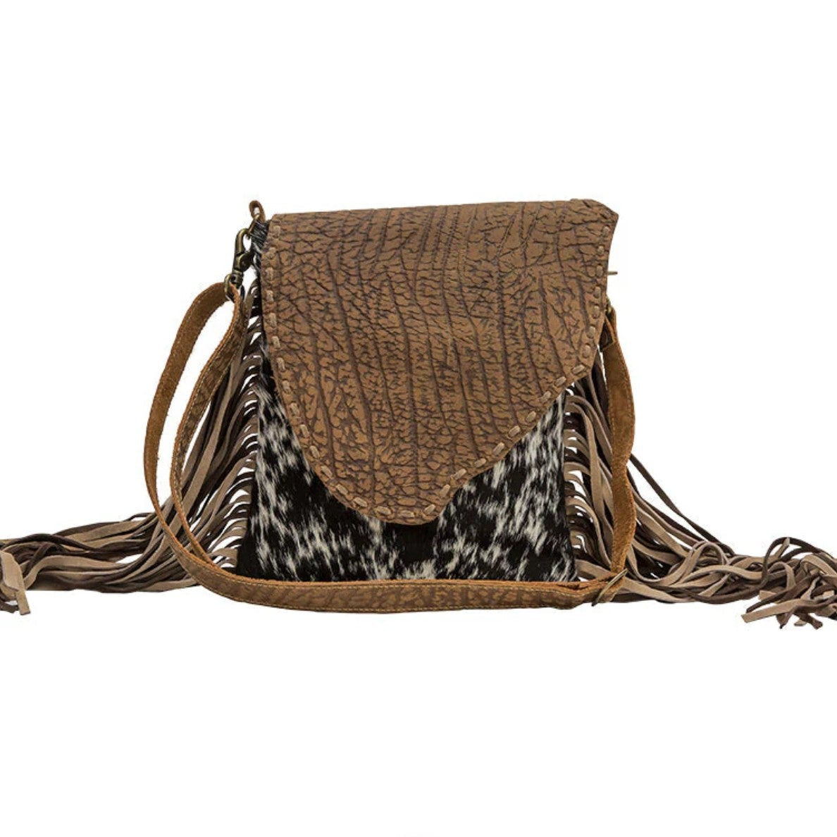 A statement bag that blends Western texture with everyday function. The Chippy Concealed Carry Bag features black-and-white hair-on hide paired with a warm brown leather flap in an asymmetrical cut. Fringe detailing adds movement, while the upcycled canvas back brings contrast and character. Designed for style without sacrificing utility.