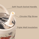 The leak-proof flip straw (straw down) stops spills before they happen, and the tapered base fits most cupholders for effortless convenience. A sturdy bucket handle and comfortable grip make it easy to carry, while the stainless steel body and rubberized bottom stand up to everyday use.