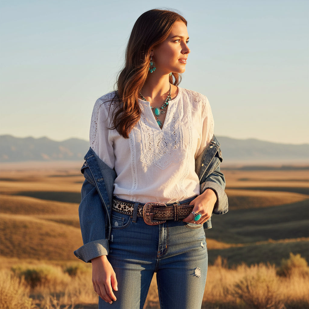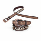 This 1.5" statement belt carries old-world craftsmanship with a bold, modern edge. Intricate hand-tooled leather stretches across the strap in a geometric floral pattern that feels rich and intentional. The polished copper buckle, fully removable, adds warmth and depth with detailed scrollwork that instantly elevates the entire piece.