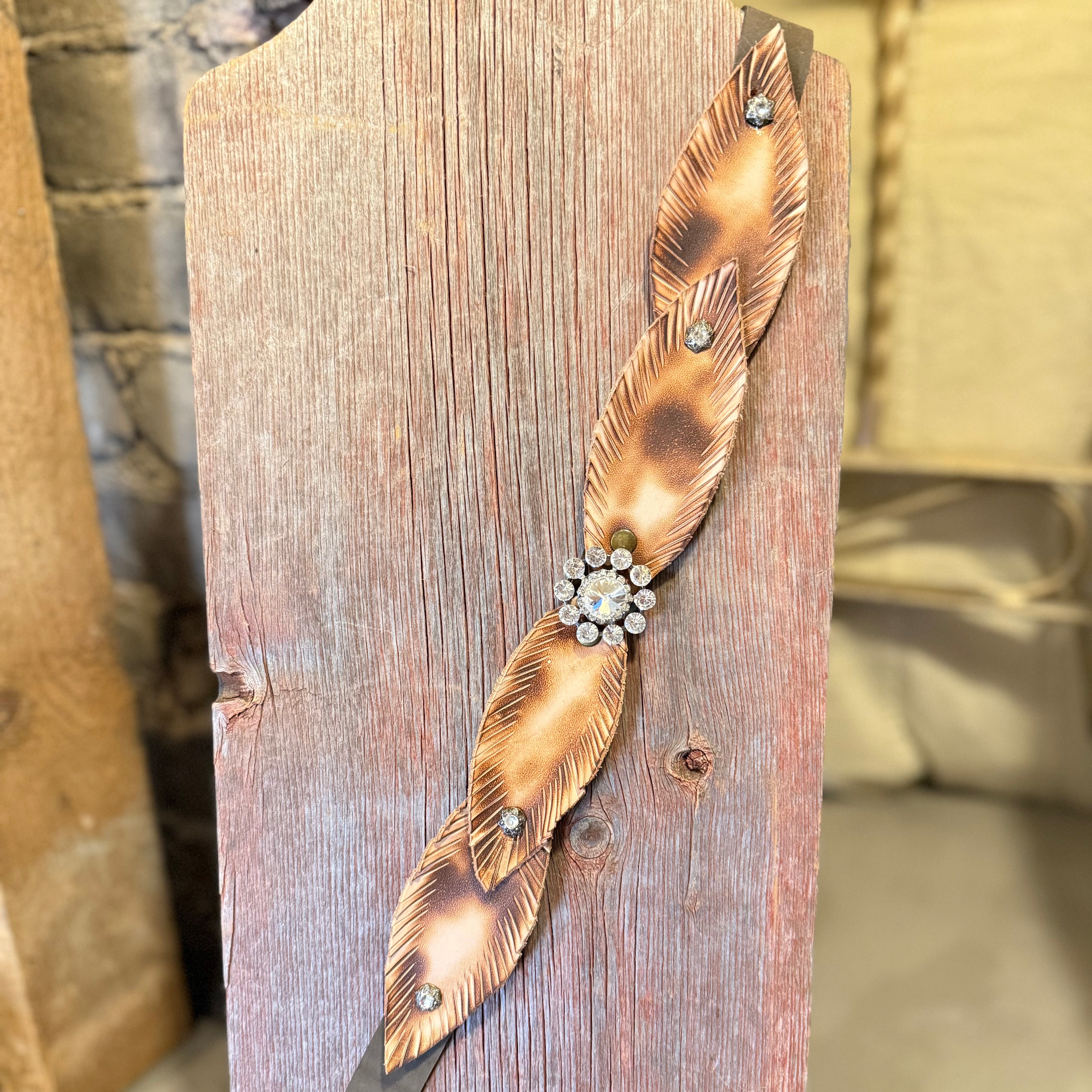 This genuine leather hat band is made to turn heads. Featuring hand-cut feather details in rich, burnished copper tones, this piece is finished with sparkling rhinestone accents and a statement concho-style centerpiece that catches the light from every angle. It’s bold, dramatic, and unapologetically western.