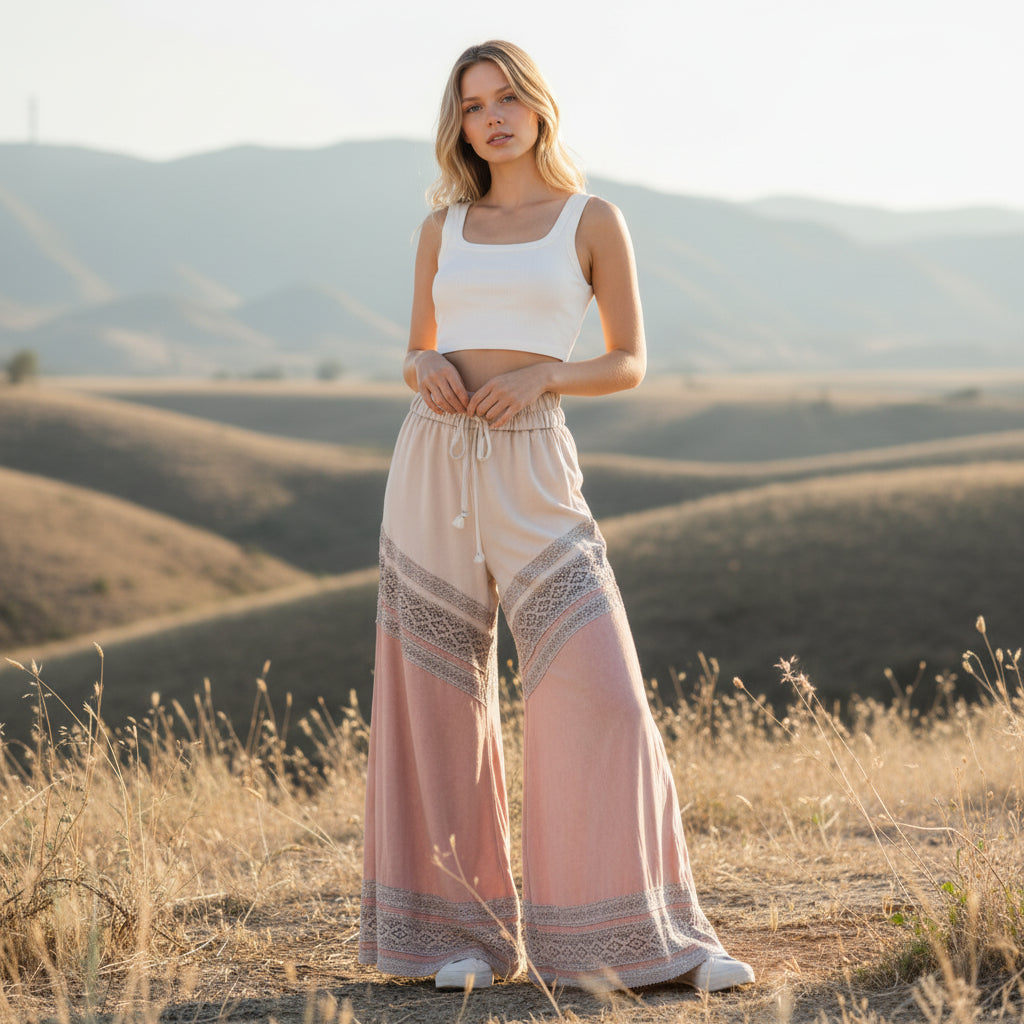 An elastic waistband with an adjustable drawstring provides a comfortable, flexible fit, making these pants easy to wear all day. Lightweight and airy, they pair perfectly with simple tanks, relaxed tops, or layered knits for a laid-back boho look. Ideal for warm weather, casual outings, or relaxed travel days, these pants blend comfort and style without effort.