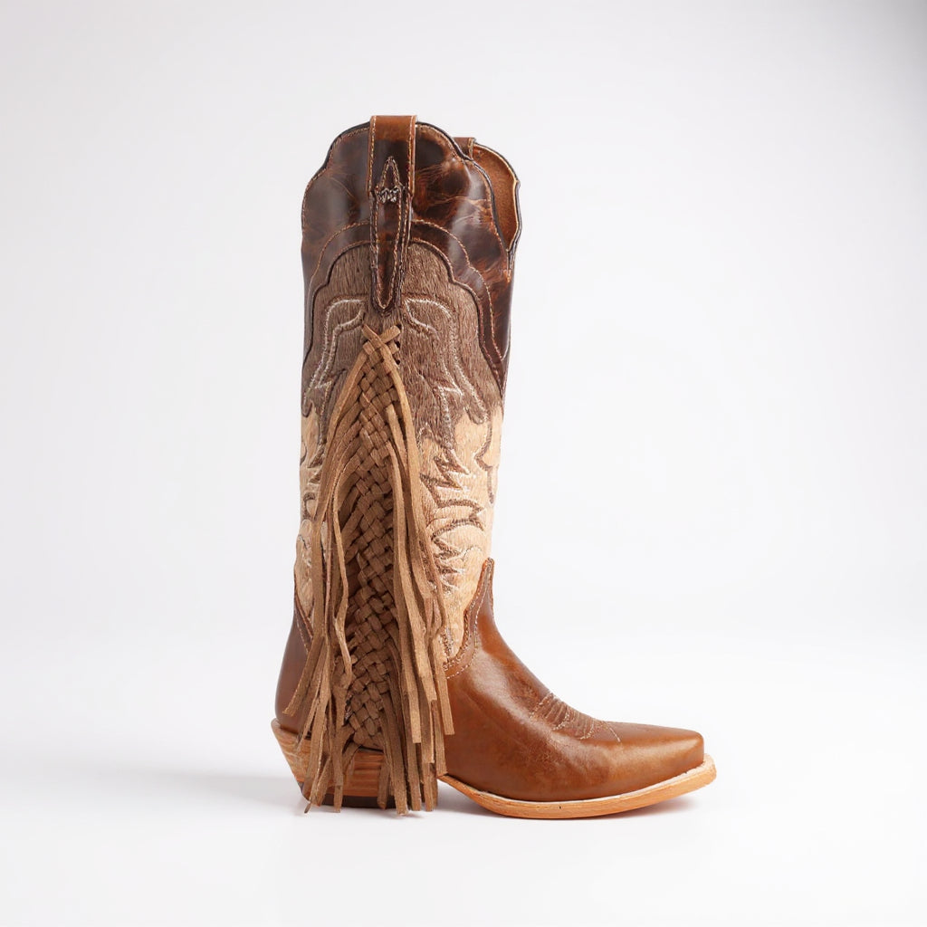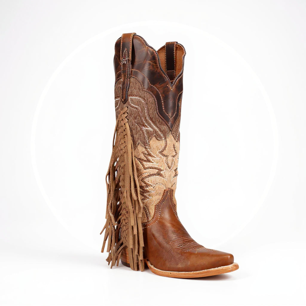 The Dan Post Dayla Leather Fringe Boot delivers classic western style with rich texture and movement. Crafted with a 15-inch leather shaft, this boot features detailed stitching and dramatic fringe that runs along the side and back, creating a bold yet timeless look. The snip toe adds a refined western finish, while the medium cowboy heel keeps the silhouette balanced and wearable.