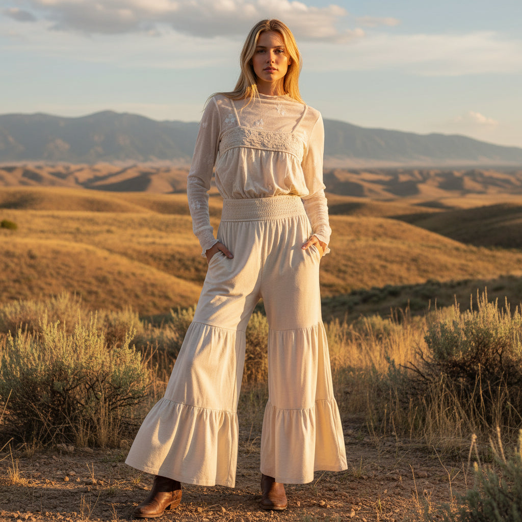 The Soft Romance Tiered Jumpsuit is effortless, flattering, and quietly beautiful. Designed with a smocked waist for a comfortable, flexible fit, this piece flows into wide legs with soft tiered detailing that moves gracefully with every step.