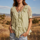 Romantic and effortlessly wearable, this soft sage peplum blouse blends feminine detail with everyday comfort. Crafted from a lightweight woven cotton blend, it features sheer floral lace accents that add texture without feeling delicate or fussy. The deep V-neckline is framed by cascading ruffles that flow into a flattering peplum silhouette, creating easy movement and shape.