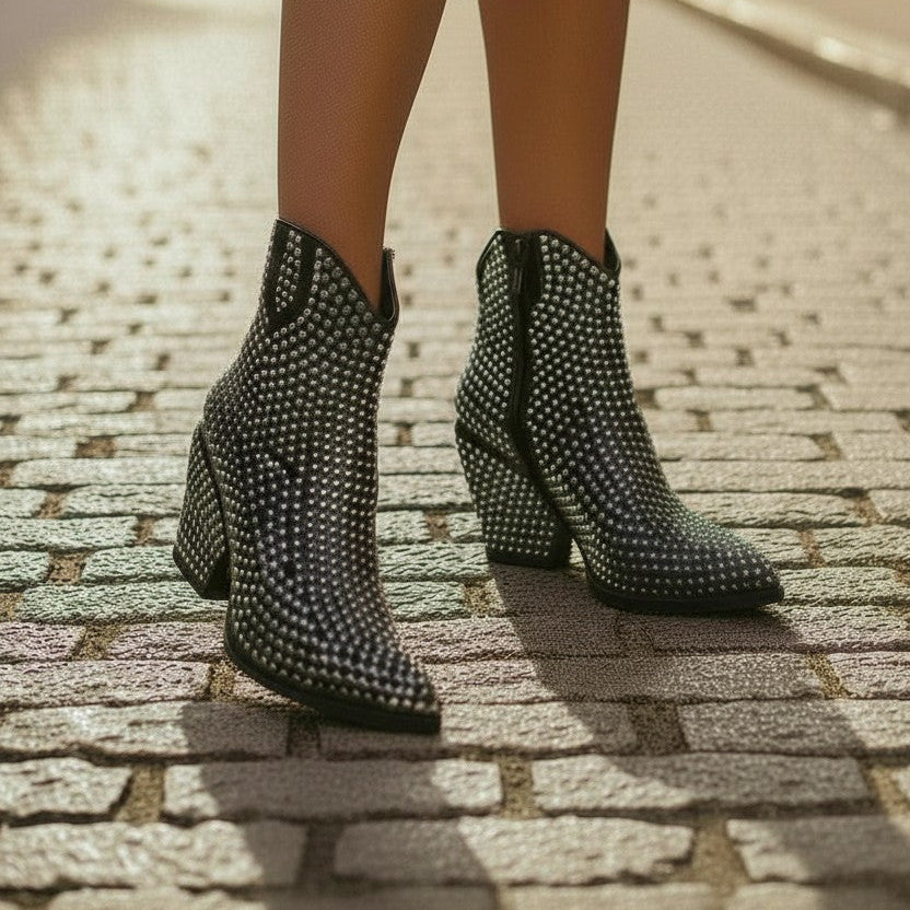 Make an entrance in the Swagger Boot by Very G. Covered in shimmering rhinestones from heel to toe, this bold ankle boot brings instant glam to any outfit. The pointed toe and angled block heel create a sleek, elevated profile, while the soft interior and easy pull-on design keep it comfortable enough for all-night wear. Whether you are dressing up denim, adding sparkle to a night out look, or making a statement at an event, the Swagger Boot delivers show stopping style with zero effort.