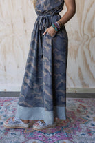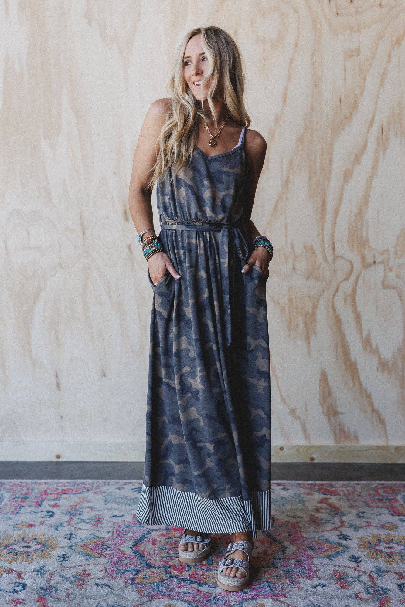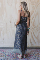 This boho maxi dress is your new go-to you’ll love to live in. * Spaghetti straps * Drawstring waist * Striped hem Model is 5'8" and wearing a size Small. Approximate measurements are as follows: * SMALL: Bust: 33“, Stretched Bust: 38“, Waist: 26“, Stretched Waist: 32“, Hip: 50“, Length: 54“ * MEDIUM: Bust: 35“, Stretched Bust: 40“, Waist: 30“, Stretched Waist: 34“, Hip: 52“, Length: 55“ * LARGE: Bust: 36“, Stretched Bust: 41“, Waist: 32“, Stretched Waist: 38“, Hip: 56“, Length: 56.5“ * X-LARGE: Bust: 38“, Stretched Bust: 42“, Waist: 34“, Stretched Waist: 42“, Hip: 58“, Length: 58“ Above measurements may vary up to 1 inch. * 88% Polyester, 9% Rayon, 3% Spandex * Hand wash cold, Lay flat to dry * Made in the USA
