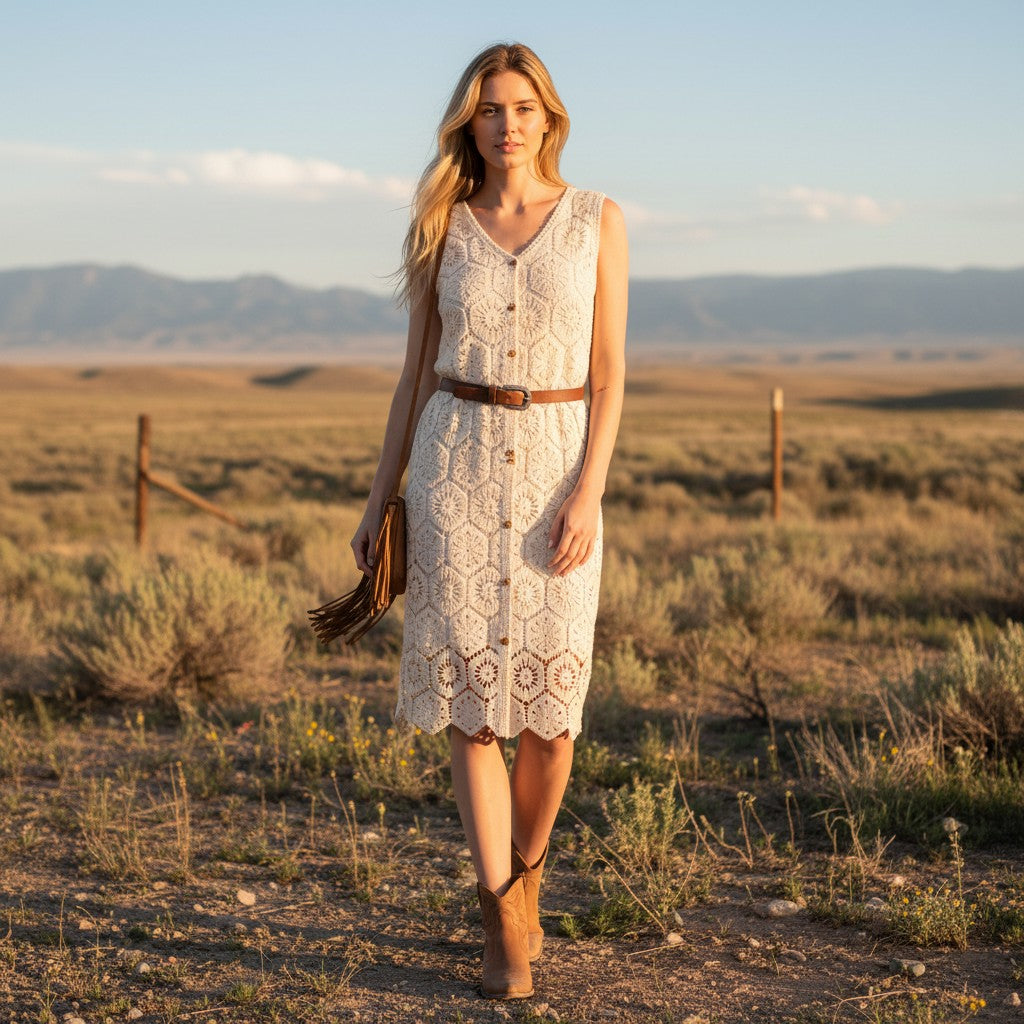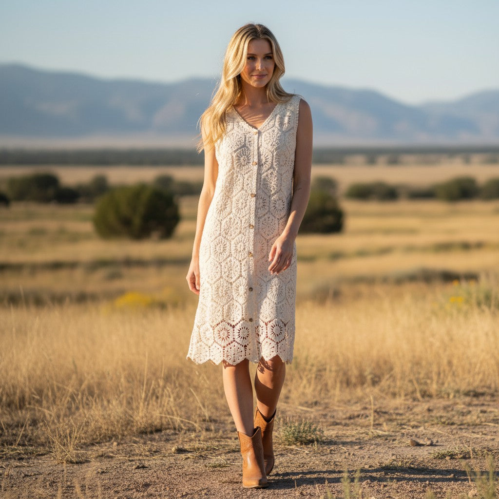 A beautifully crafted midi dress featuring intricate crochet detailing and a timeless sleeveless silhouette. Designed with a flattering V-neckline and button-front accents, this piece blends delicate texture with effortless elegance.