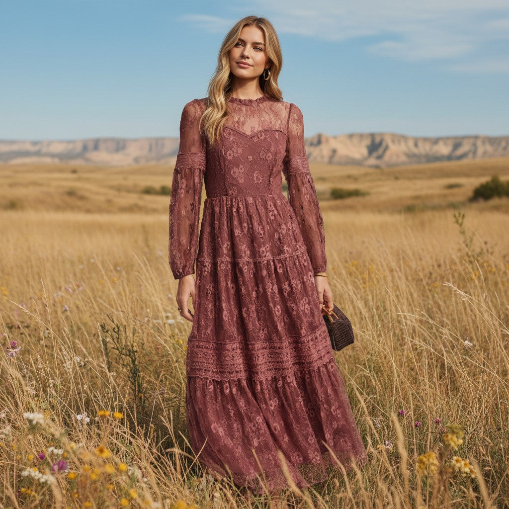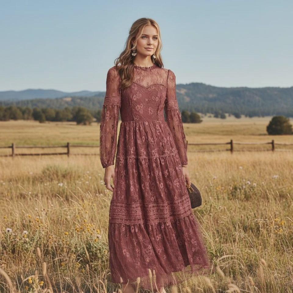 Romantic and timeless, the Dusty Rose Lace Maxi Dress is made for moments that call for something a little special. Crafted from delicate floral lace, this flowing maxi features soft tiers that create beautiful movement with every step. The long sheer sleeves and high neckline add a touch of vintage elegance, while the fitted bodice flatters the waist before falling into a graceful full skirt.