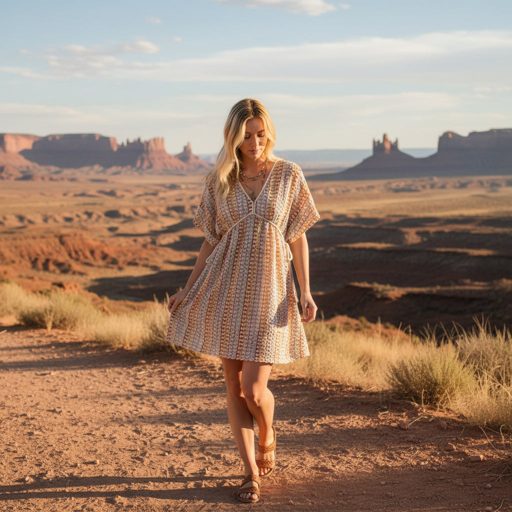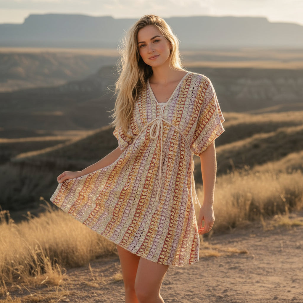 Light, airy, and made for warm days. The Golden Hour Crochet Cover Dress features an open crochet knit with a soft, multicolor pattern that feels relaxed and effortlessly feminine. The flowy silhouette and wide sleeves create easy movement, while the V-neckline adds a flattering, laid-back shape.