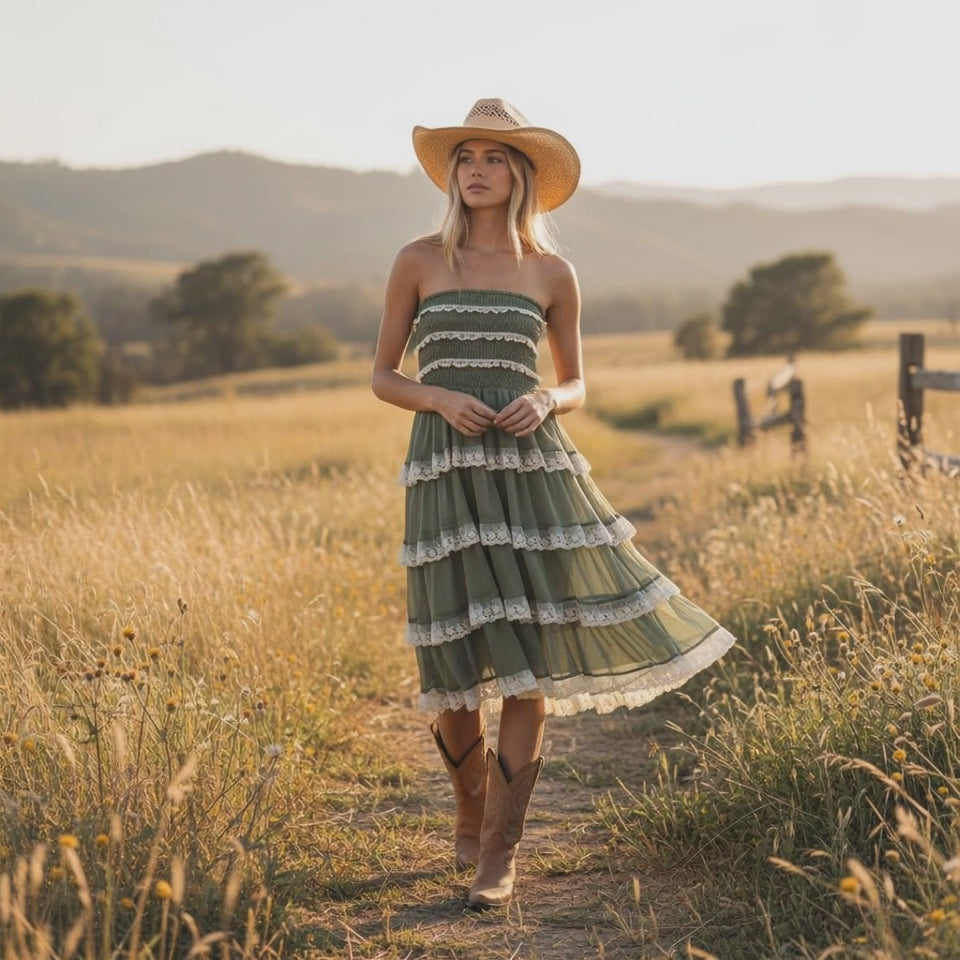 Soft, romantic, and incredibly versatile, the Sagebrush Two-Way Lace Tiered Dress can be worn two ways: as a strapless smocked midi dress or styled as a flowing maxi skirt. The stretchy smocked bodice creates a flattering, comfortable fit, while cascading tiers trimmed with delicate lace add beautiful movement and texture.