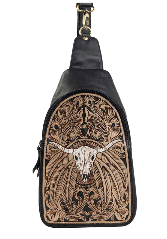 This magnificent sling bag combines amazing design style with ease of movement. It features gorgeous ebony leather, paired perfectly with a panel of artisan hand-tooled leather with a lone steer skull centerpiece. Wear it on your side, back or front, just as you need. Comfortable, adjustable shoulder strap is canvas and leather. It's perfect for on-the-go lifestyles!
