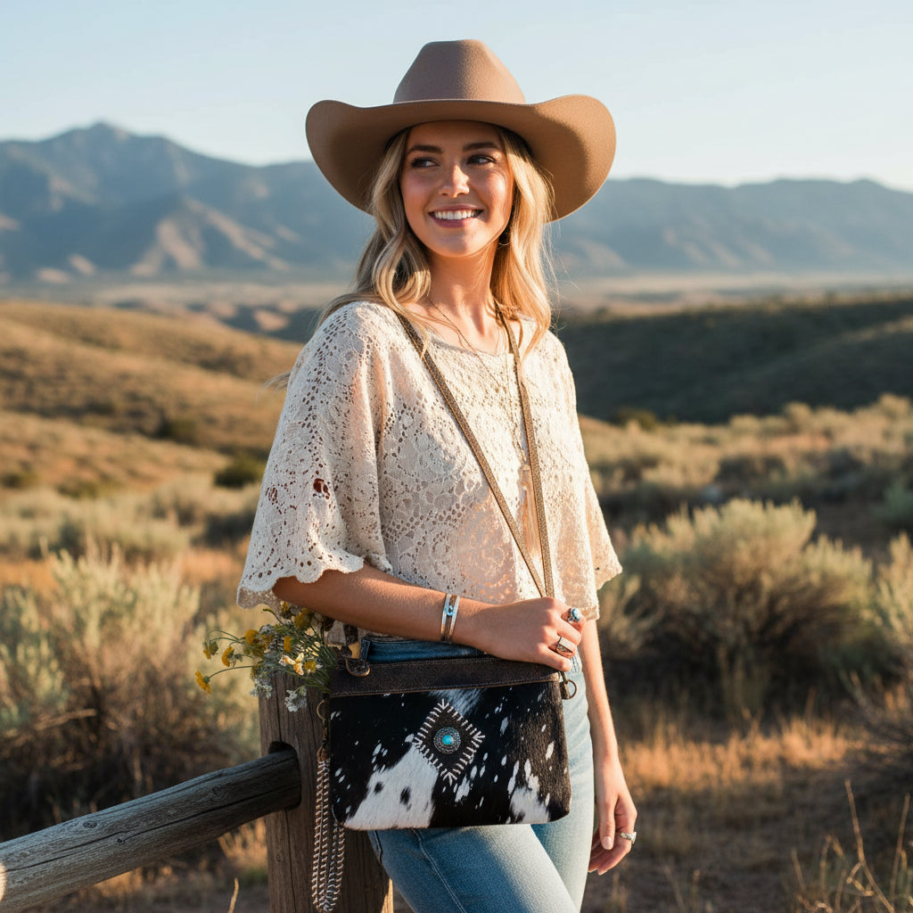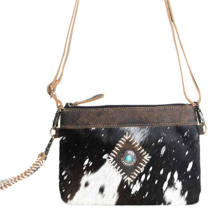 Made with authentic hair-on cowhide in a striking black and white pattern, each bag is completely unique. No two hides are ever the same, which means yours will have its own natural markings and character. The turquoise-accented leather medallion adds that unmistakable western soul right at the center.