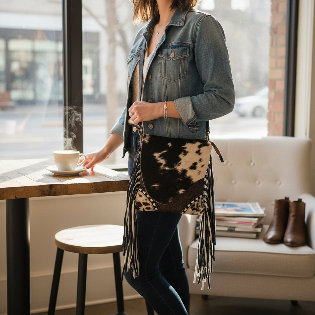 Bold, textured, and unmistakably western, the Corral Tempo Fringed Concealed Carry Bag is designed to stand out while staying practical. The front flap features an irregular cut of hair-on hide, making each bag completely unique, paired with a deep bourbon-brown embossed leather panel for added richness. Long leather fringe along the sides brings movement and edge without feeling overdone.