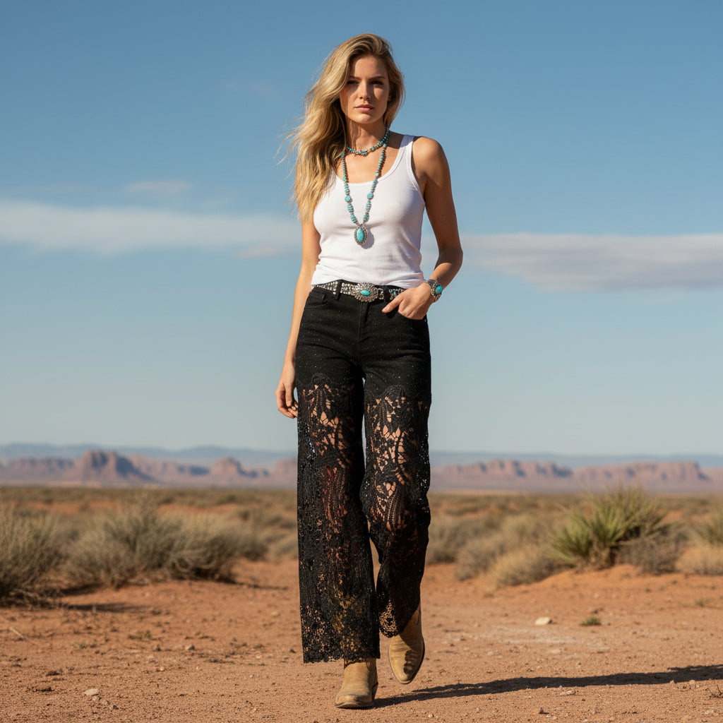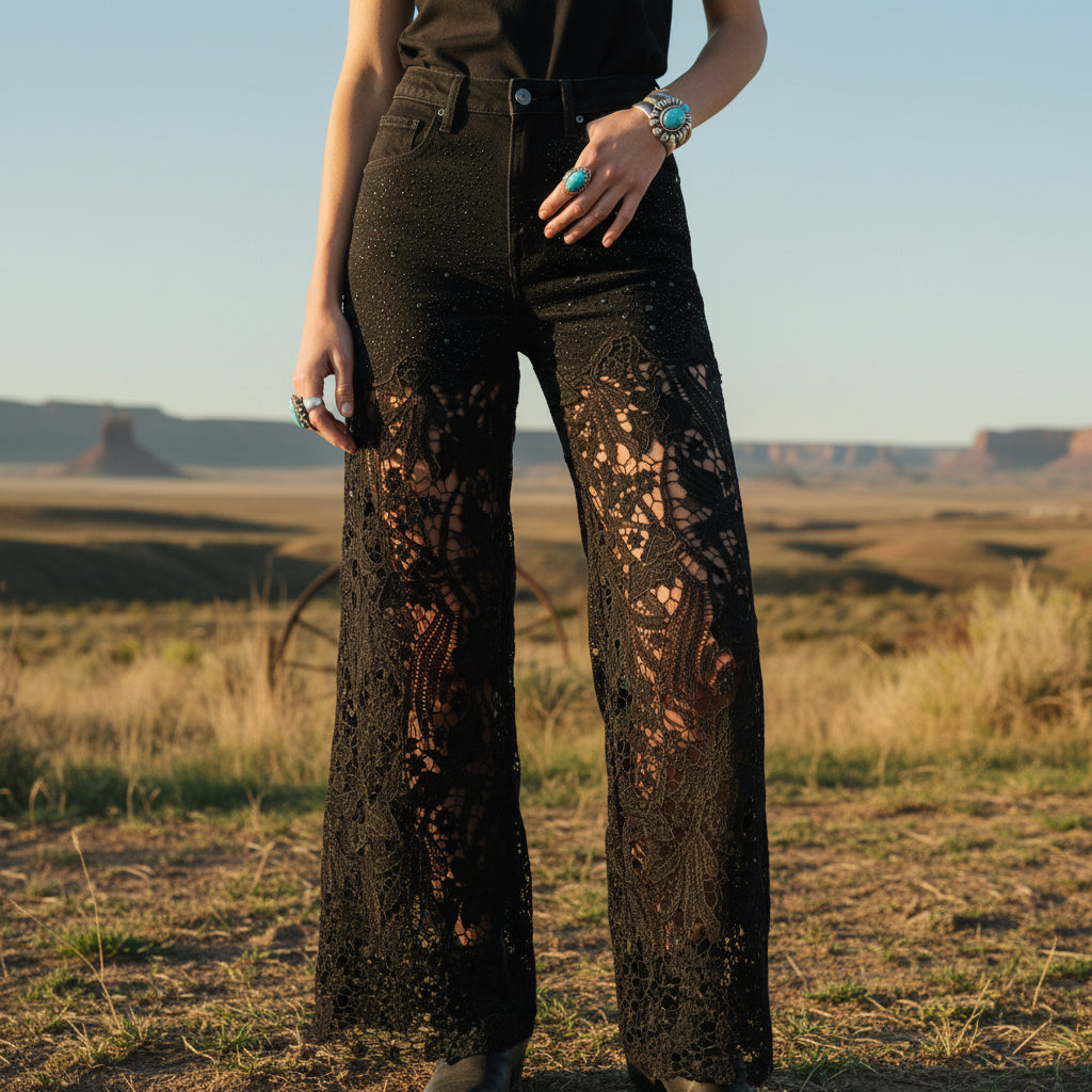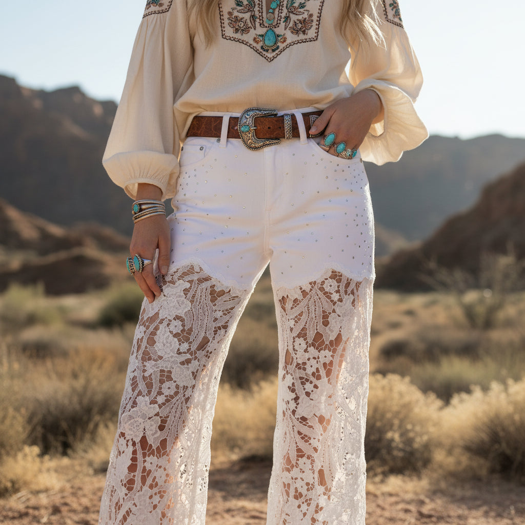 High rise with a structured denim top that holds you in, then it drops into the most beautiful lace wide leg. Rhinestone details catch the light just enough without feeling flashy. The lace falls soft and dramatic to the hem, giving it that boutique statement energy you don’t see everywhere.