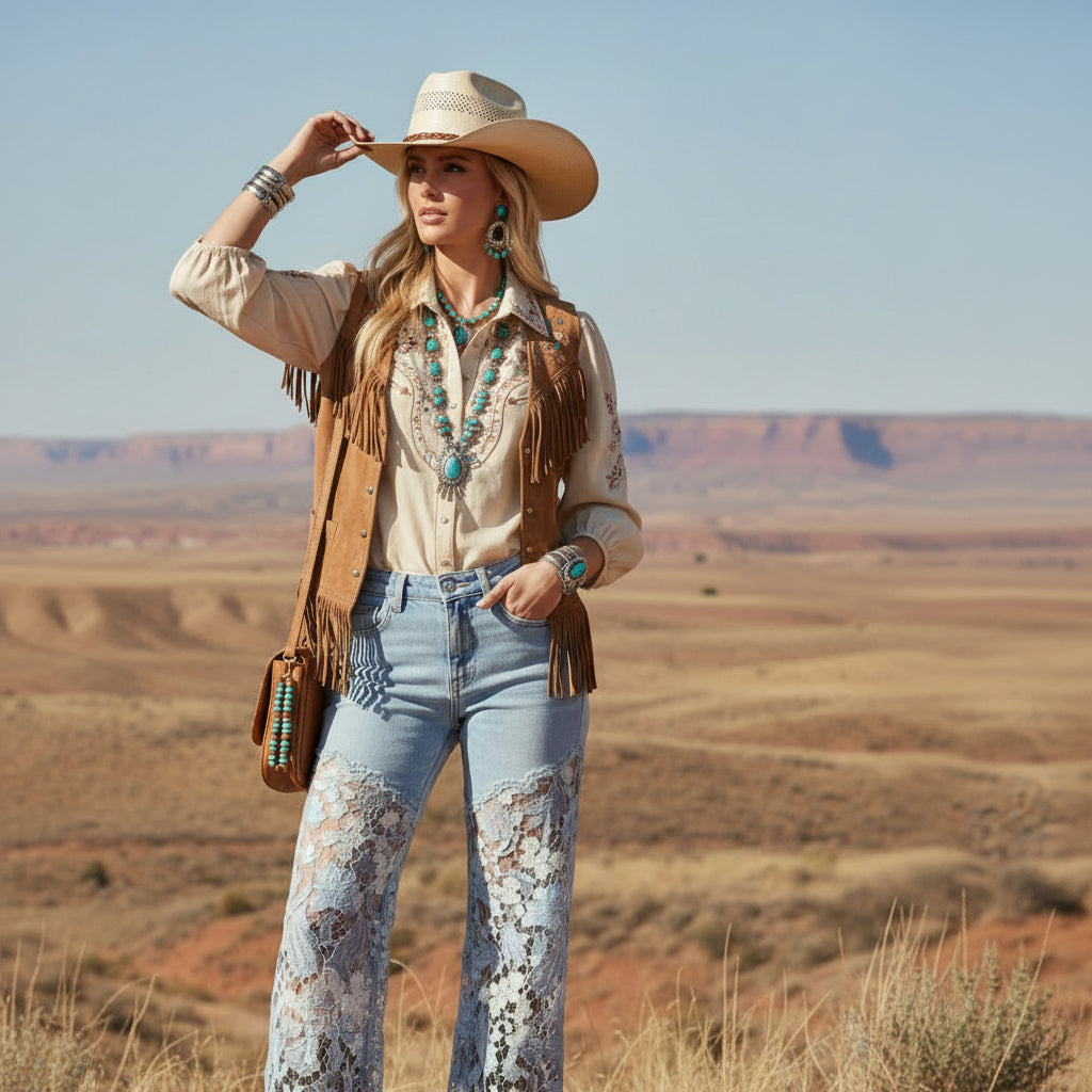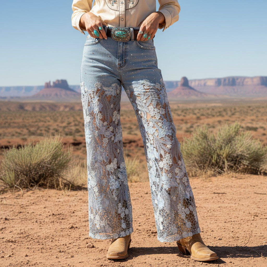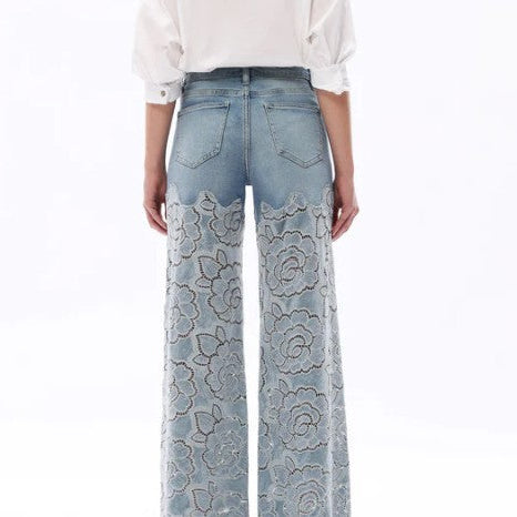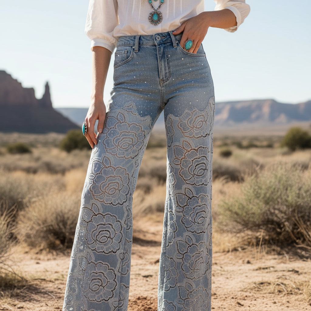 High rise with a structured denim top that holds you in, then it drops into the most beautiful lace wide leg. Rhinestone details catch the light just enough without feeling flashy. The lace falls soft and dramatic to the hem, giving it that boutique statement energy you don’t see everywhere.