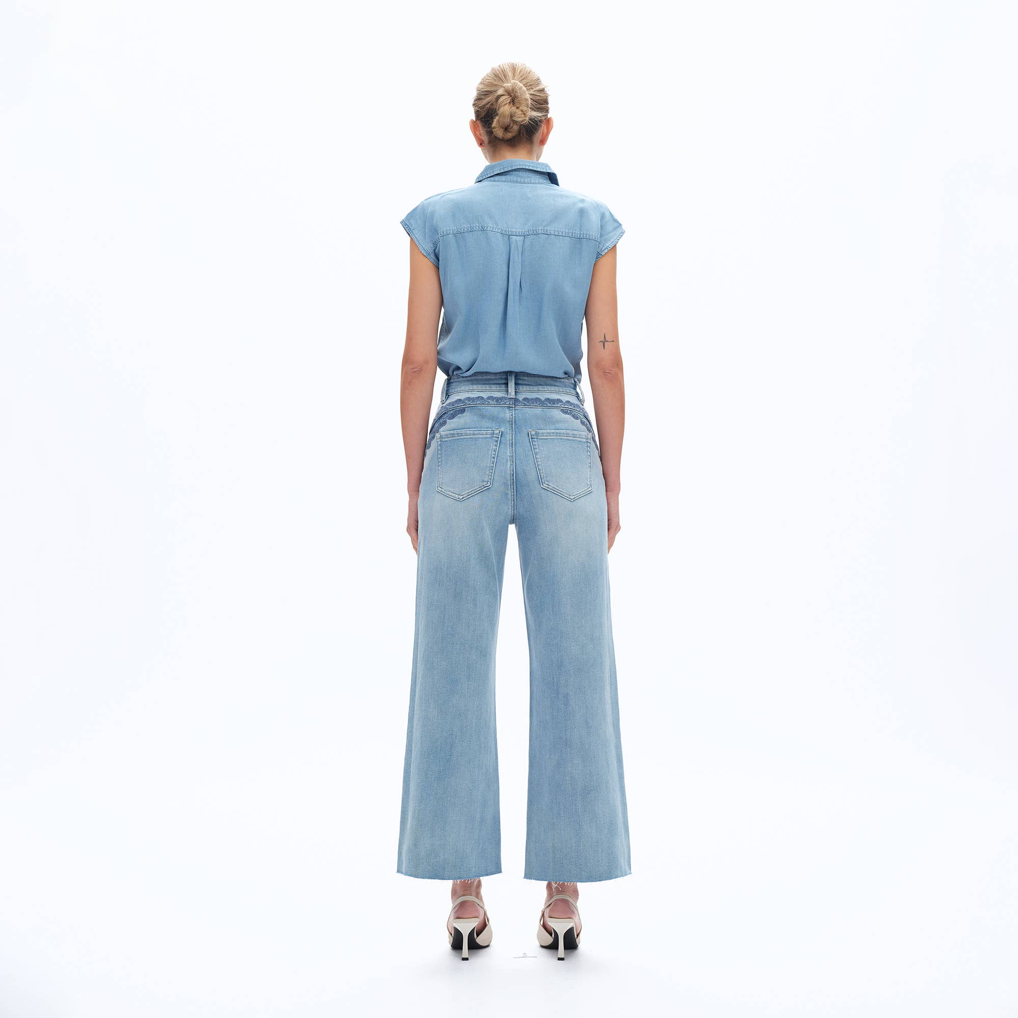 The wide-leg silhouette offers a relaxed, elongating fit, while the contrast side panels add structure and a slimming effect. Perfect for styling with a tucked blouse, a crisp chambray, or a cozy sweater for fall.