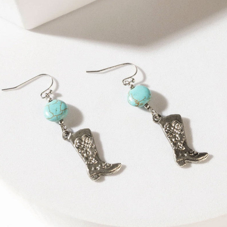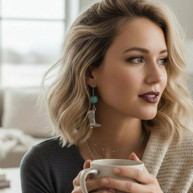 A little Western attitude goes a long way. The Boots Before Noon Earrings feature detailed silver-tone boot charms paired with sky teal turquoise beads for a playful, statement-making finish. Lightweight and easy to wear, they add just the right amount of personality to everyday outfits or dressed-up Western looks.