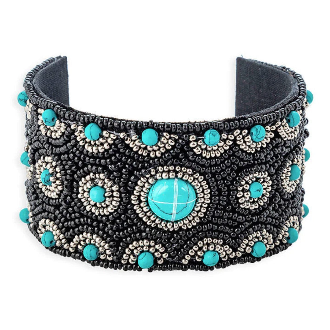 A statement cuff with rich texture and striking contrast. The Corsikka Beaded Cuff features deep ebony beading accented with turquoise cabochons arranged throughout for a bold, dimensional look. The wide silhouette and detailed beadwork give it a handcrafted feel that stands out on its own.