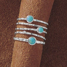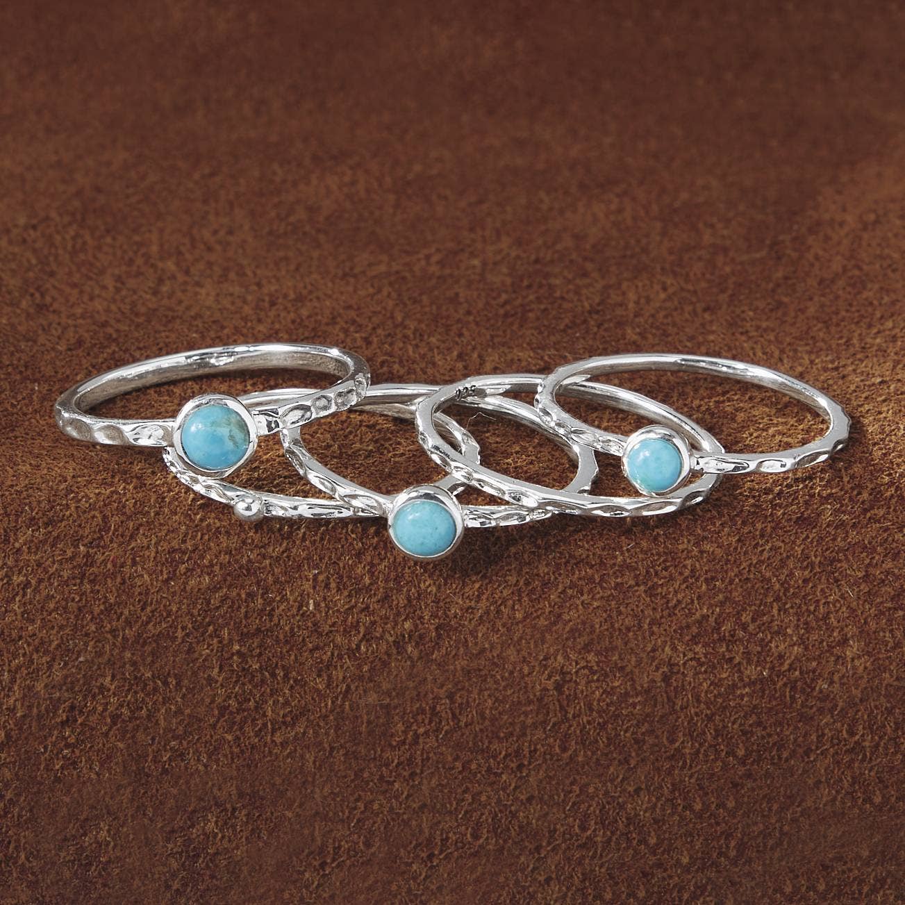 Textural bands of sterling silver pop with multi-sized, genuine blue turquoise stones on 3 bands. 1/2" wide when stacked. Allow for natural variations in the stones.