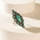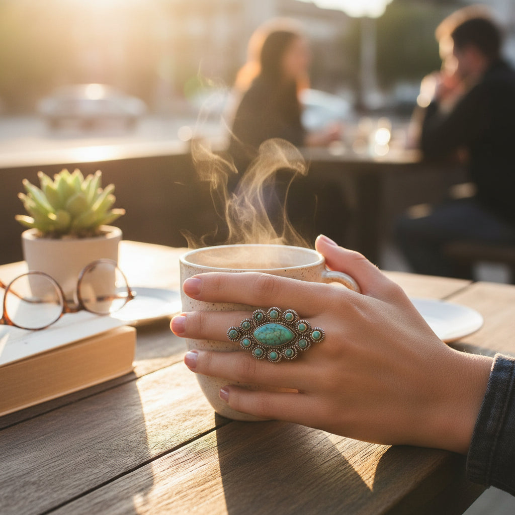 Striking yet timeless, The Oathkeeper Ring is a statement piece rooted in Southwestern influence and vintage character. An elongated marquise turquoise stone anchors the design, surrounded by a halo of smaller turquoise accents and detailed silver-tone metalwork. The result is bold without being loud, expressive without feeling overdone.