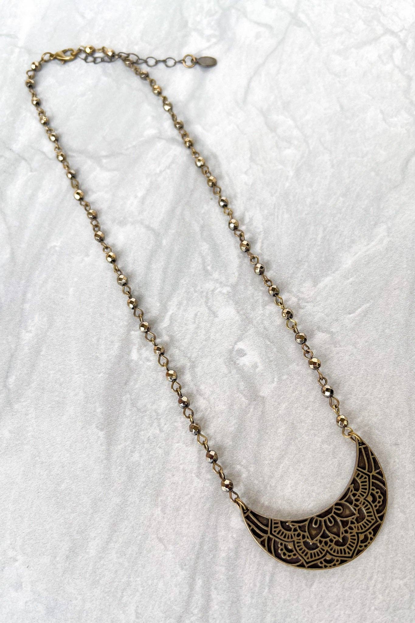Single strand short chain link necklace with glass beads throughout the chain. Features a crescent shaped pendant with beautiful engraving on the front!