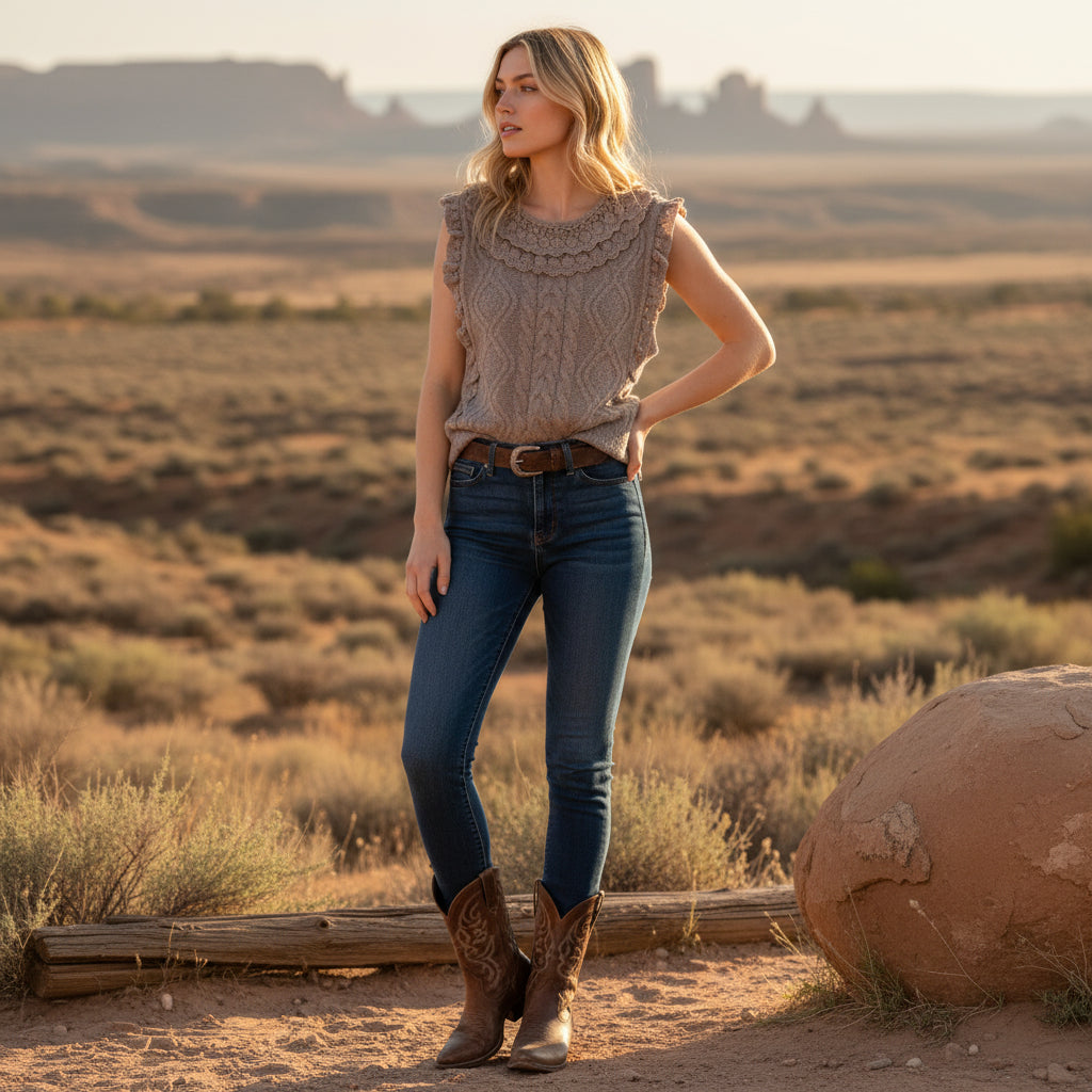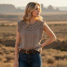 This sleeveless knit top blends soft texture with elevated detail for an effortlessly styled look. Designed with a cable knit-inspired pattern through the body, it features delicate lace trim along the neckline and subtle ruffle detailing at the shoulders for a feminine finish. The neutral tone makes it an easy piece to layer or wear on its own.