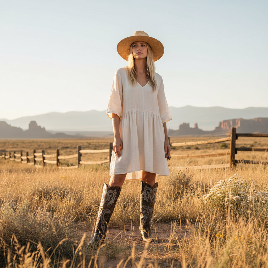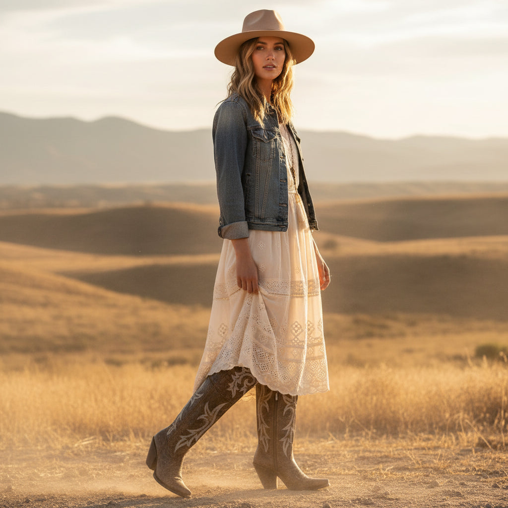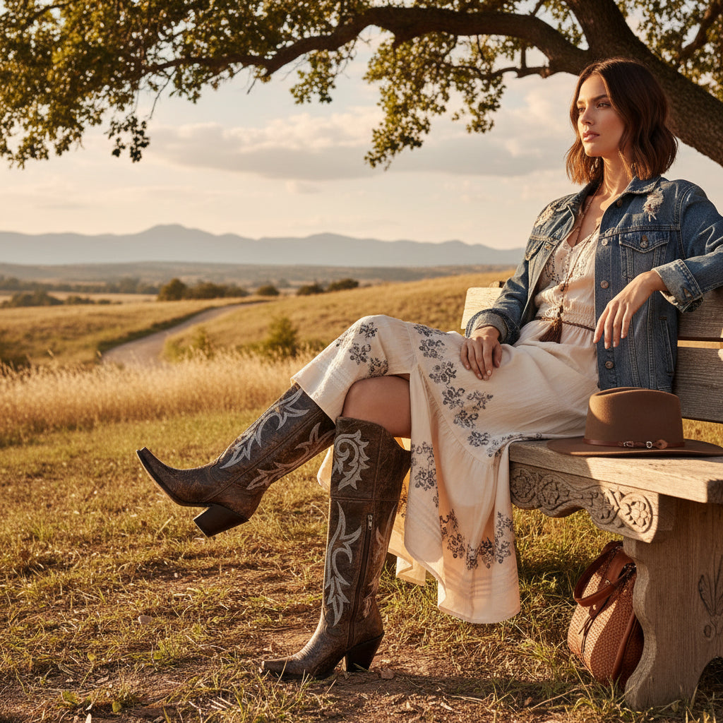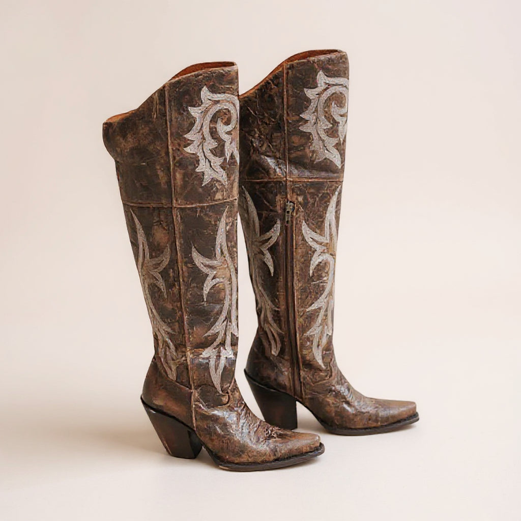 The Dan Post Jilted Brown Over-the-Knee Boot is a bold, fashion-forward take on classic western craftsmanship. Designed with a 20-inch leather shaft and a sleek snip toe, this boot delivers striking height and a refined silhouette. Tonal stitching adds subtle western character, while the 2.5-inch fashion heel provides confident lift without sacrificing wearability.