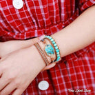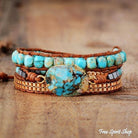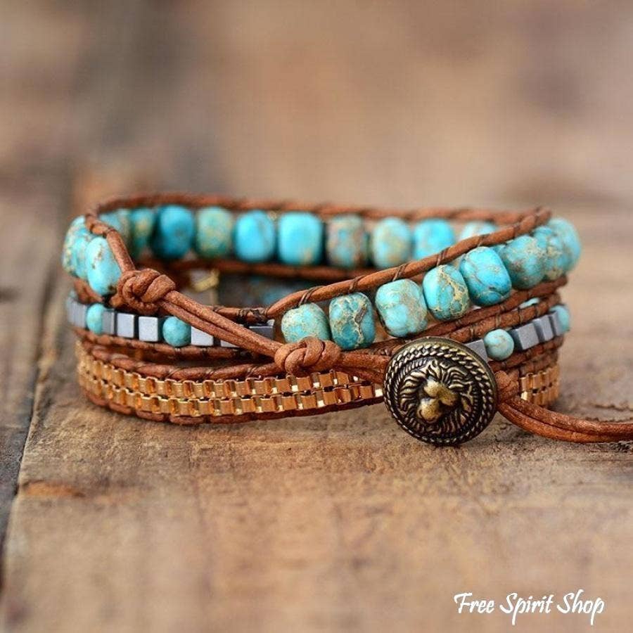 This beautiful beaded wrap bracelet is handmade with turquoise howlite beads. It is mounted on genuine leather. Materials: Turquoise Howlite, Genuine Leather Metal: Stainless Steel Size: Around 19.6 inches + 3 closures for adjustment. Handmade.