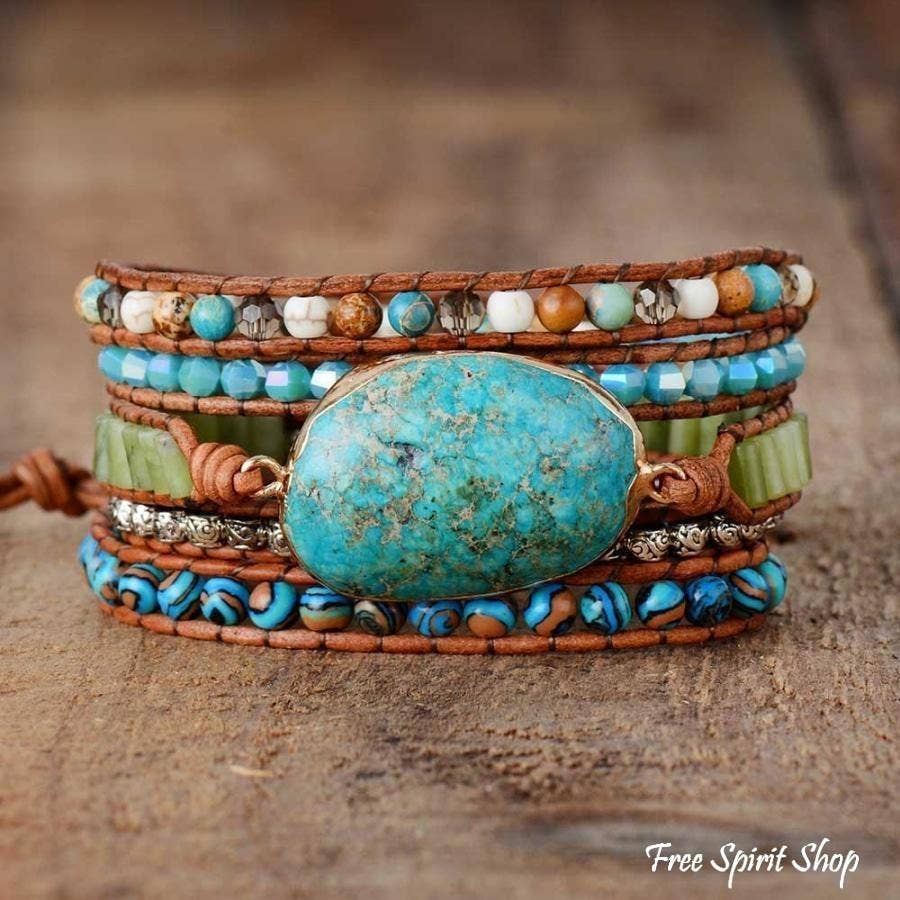 This beautiful beaded wrap bracelet is handmade with natural stones and mixed beads. It is mounted on genuine leather. Materials: Turquoise Jasper, Genuine Leather Metal: Stainless Steel Size: Around 33.5 inches + 3 closures for adjustment. Handmade.