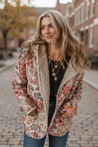 Beige Vintage Paisley Floral Printed Sherpa Lined Hooded Jacket