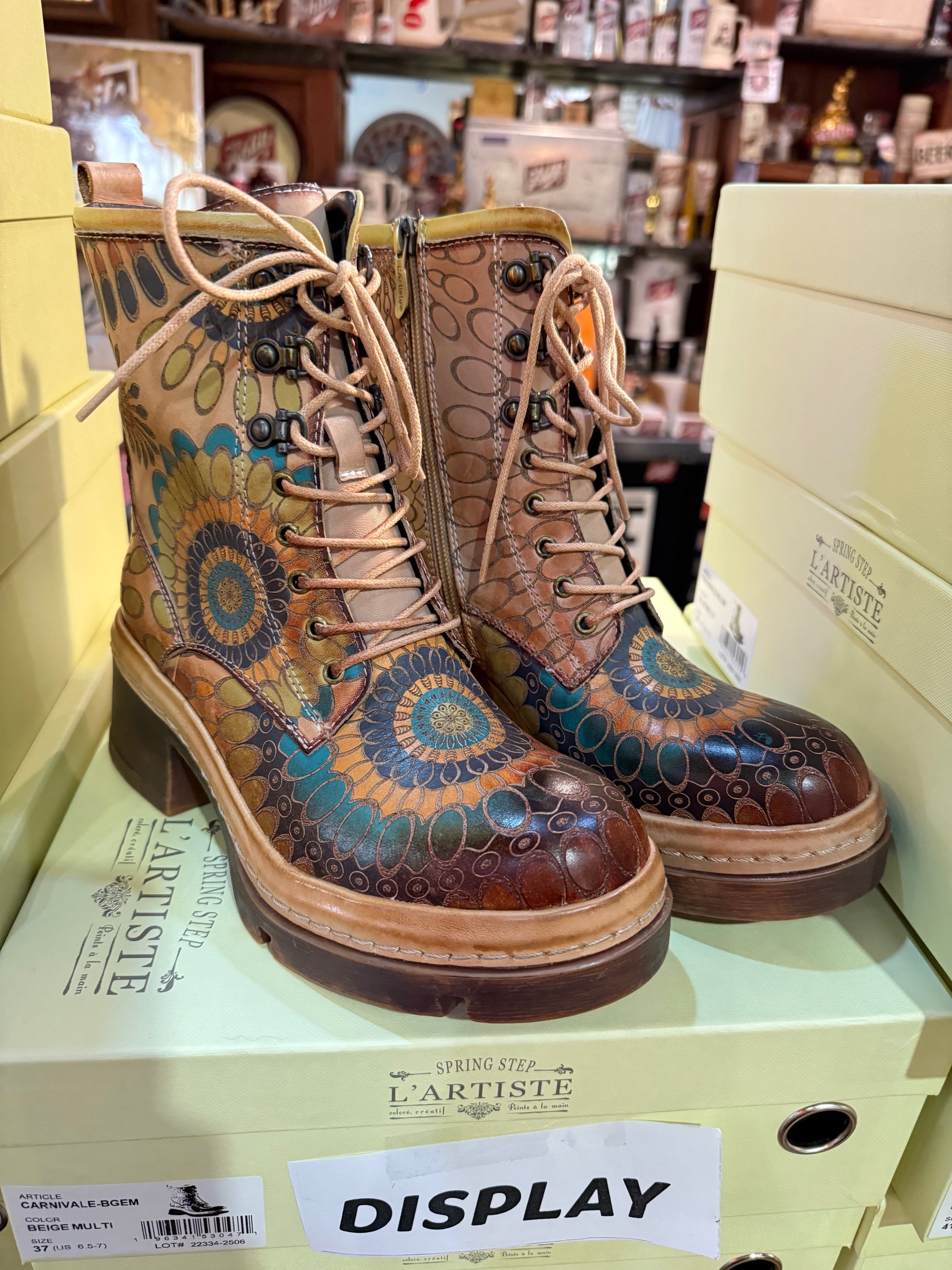 Art you can walk in. The L’Artiste Carnivale Boots are a true statement piece, featuring hand-painted leather with intricate mandala-inspired detailing that feels bold, artistic, and unmistakably unique. Every pair has its own character, making these boots as individual as the person wearing them.