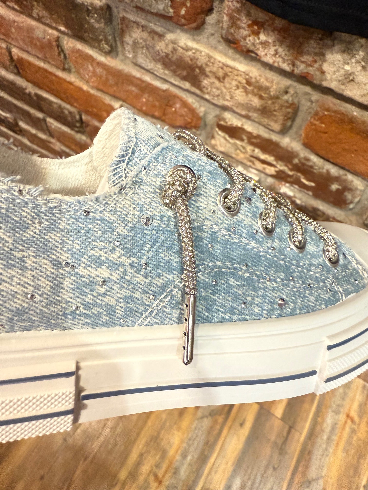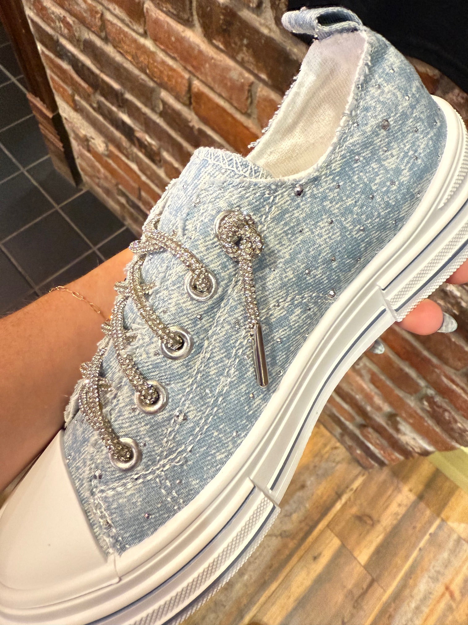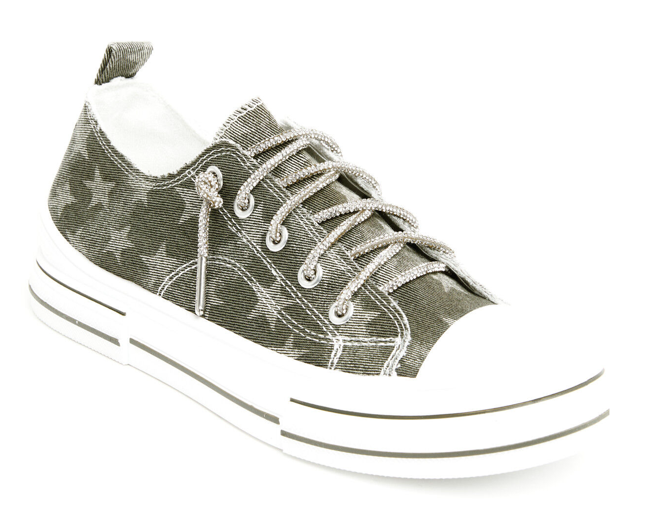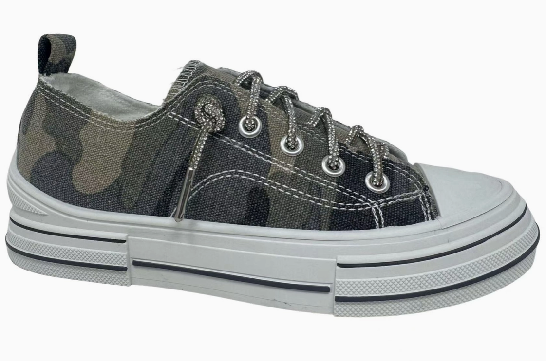 Meet your new everyday favorite. This best-selling sneaker combines comfort, sparkle, and effortless style with a cushioned insole and our signature rhinestone-dusted laces. The 1-inch platform sole adds just the right amount of lift, while the rubber toe guard keeps things practical for all-day wear. Available in multiple colors and patterns, with this camo version being a customer favorite.