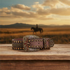 Warm, bold, and full of western character, the High Desert Ember Studded Belt is designed to make a statement without overpowering your look. Crafted in a deep brown tone, it features an ornate western buckle accented with mixed metal studs and subtle rhinestone detailing for layered texture and depth.
