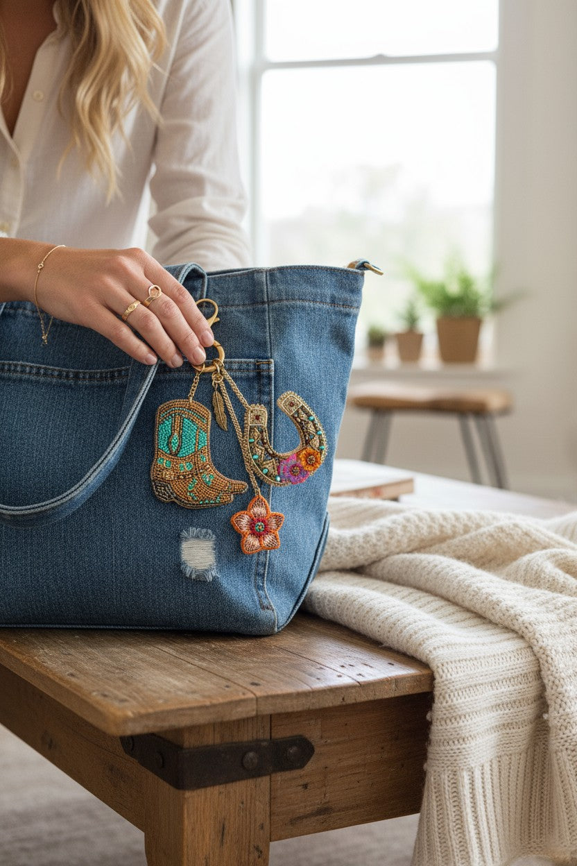 Saddle up your style with this wild western charm! Featuring a beaded boot, lucky horseshoe, and bright desert bloom, it’s a little piece of rodeo magic ready to clip on and giddy up your bag, keys, or wristlet. It’s the perfect partner for our On the Range Mini Crossbody or Line Dance Handbag.