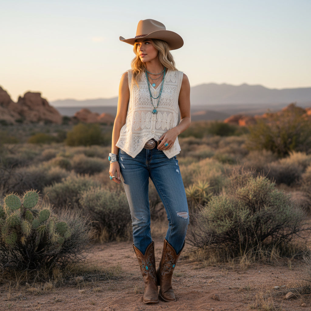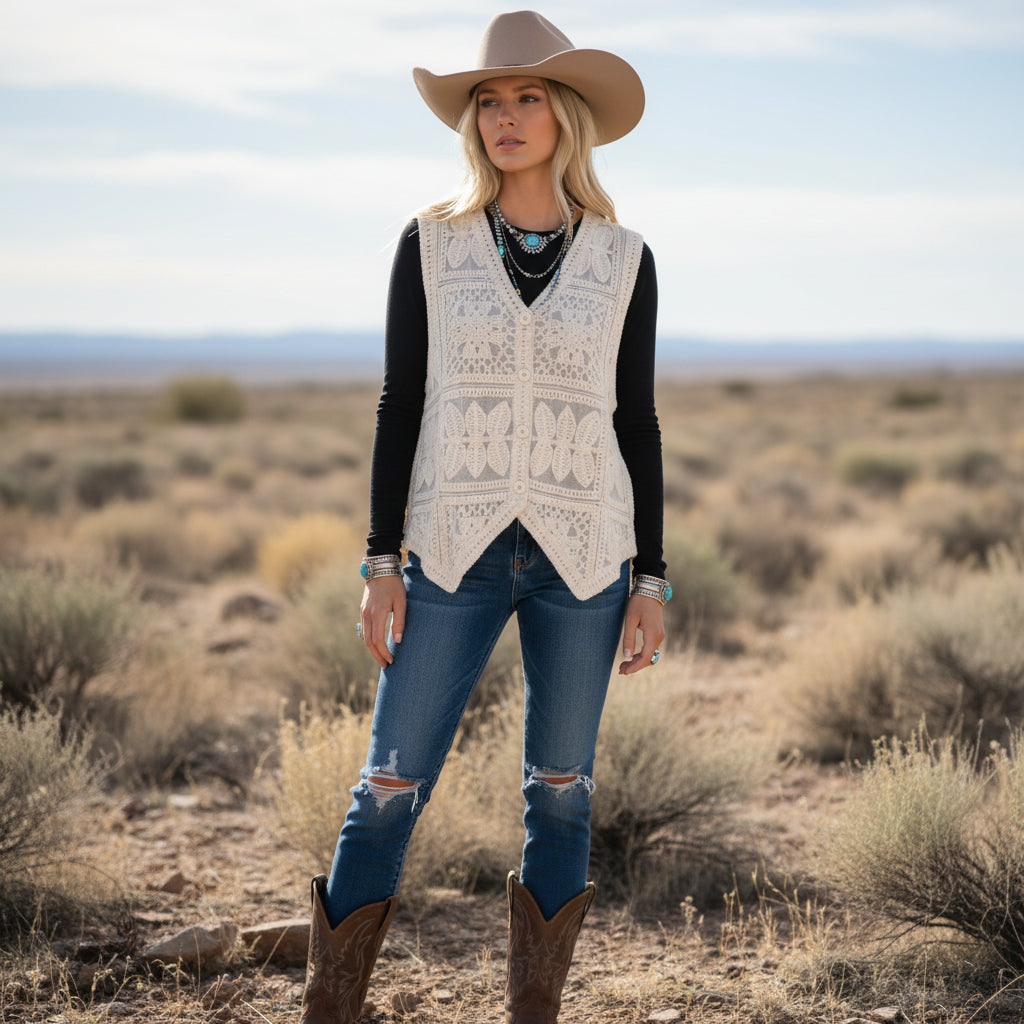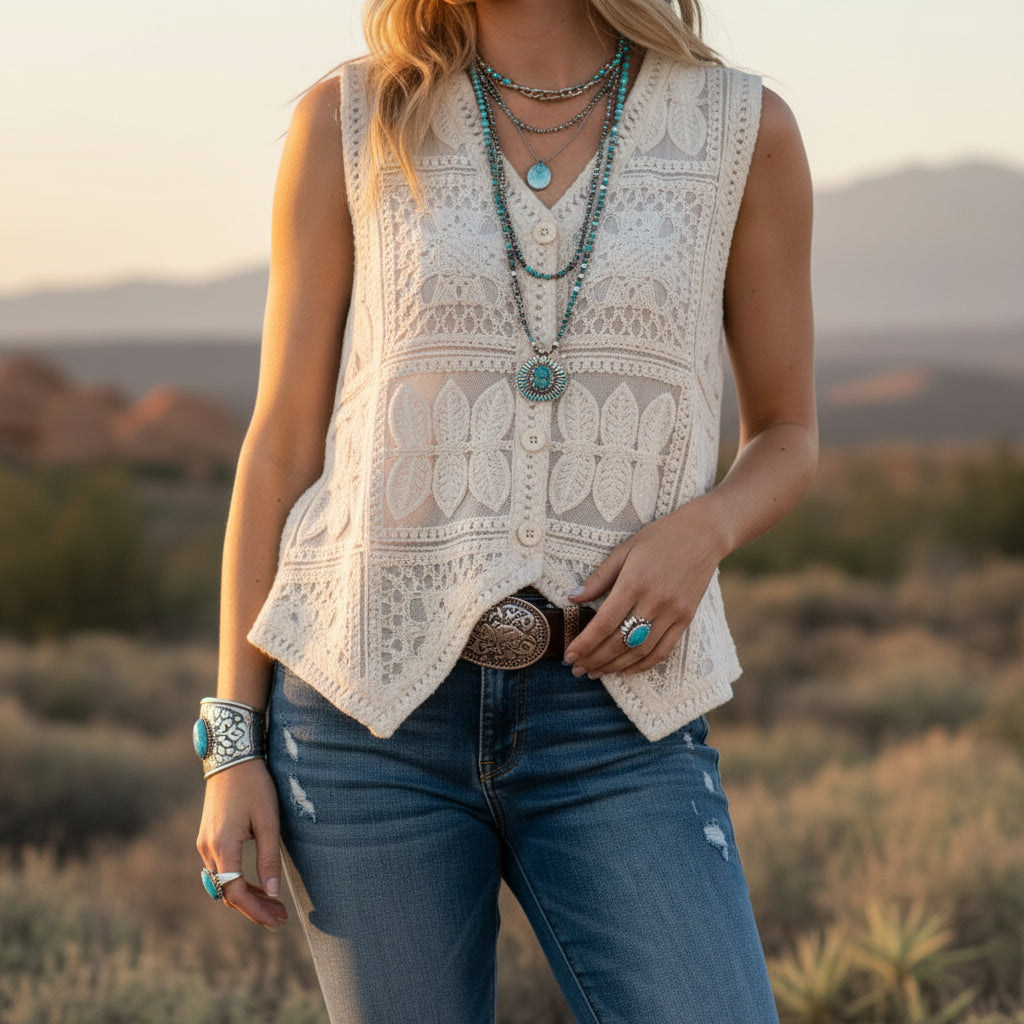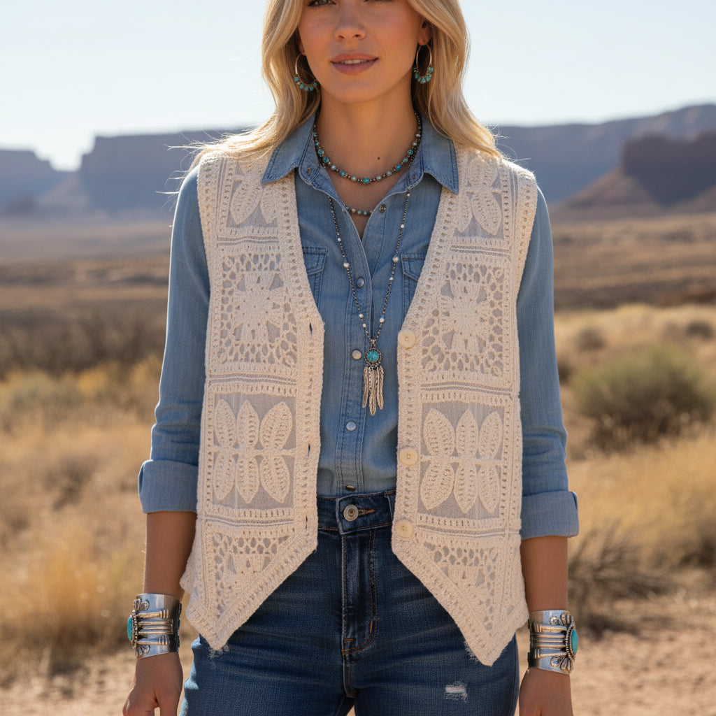 This crochet lace vest is detailed with intricate openwork patterns that feel delicate but intentional. The soft ivory tone keeps it fresh and versatile, while the button-front closure adds just enough structure to balance the femininity of the lace.