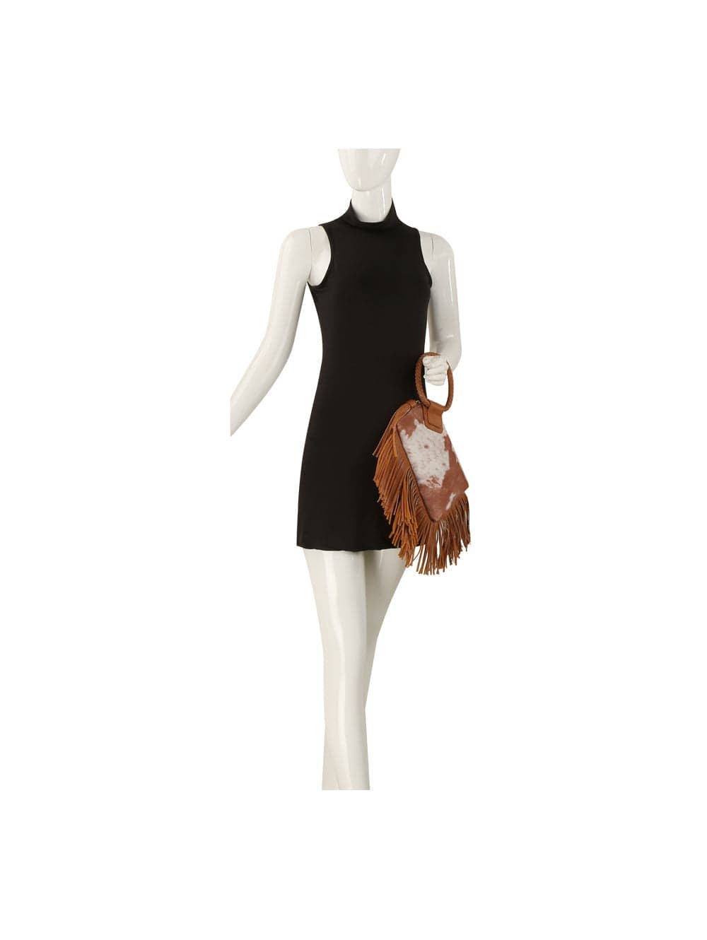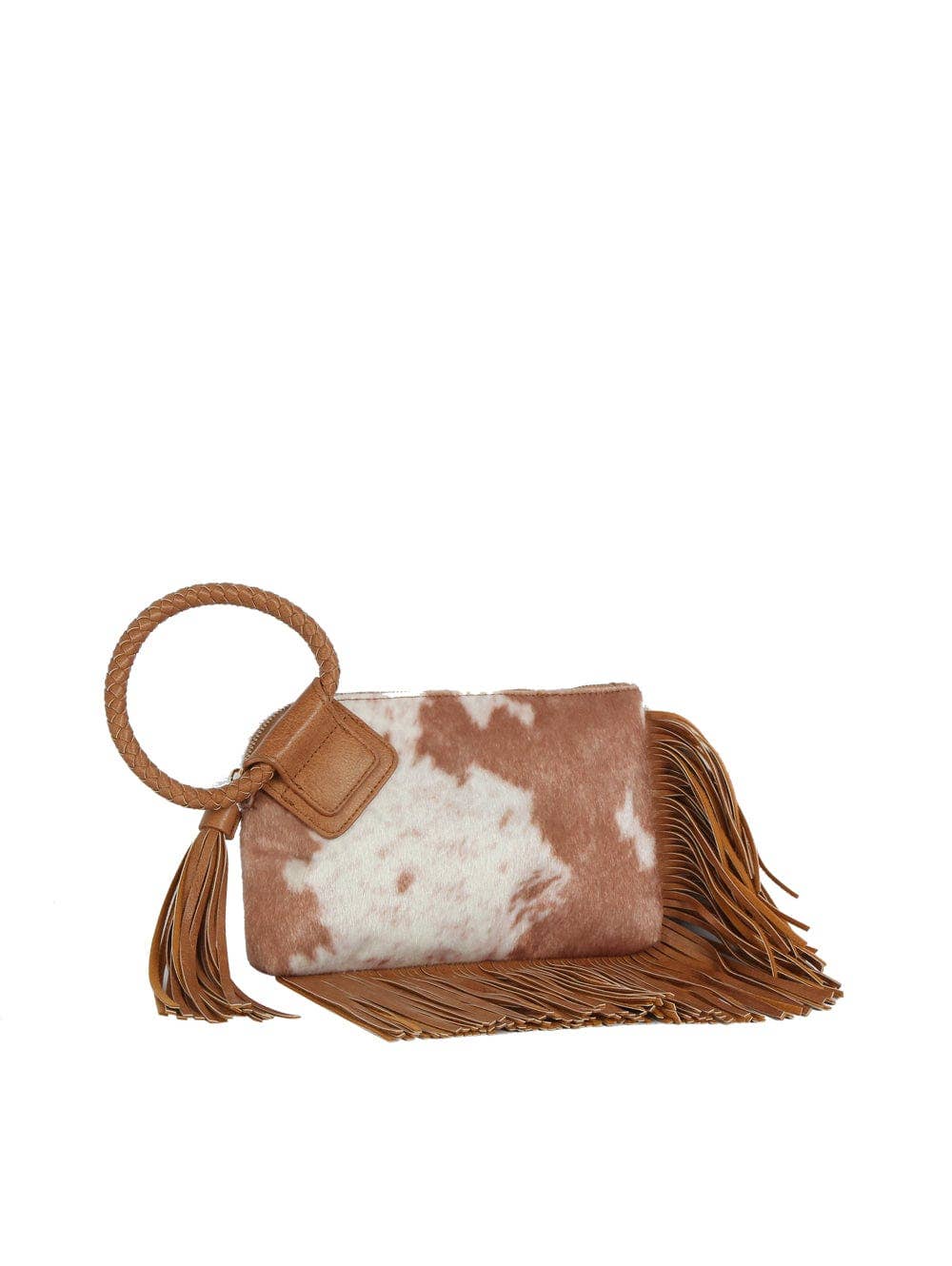 Vegan Suede Cow Print Fringe Wristlet/Clutch With Tassel