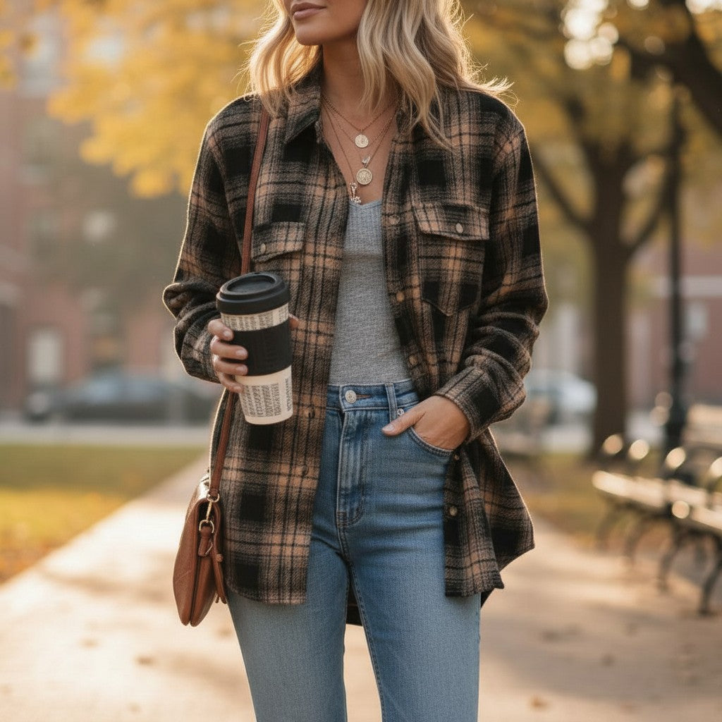 A versatile shacket designed for easy layering and everyday comfort. Featuring a vintage-inspired plaid pattern, this piece blends the structure of a jacket with the relaxed feel of a shirt. The brushed fabric finish adds softness and warmth without feeling bulky, making it ideal for transitional seasons.