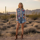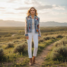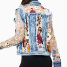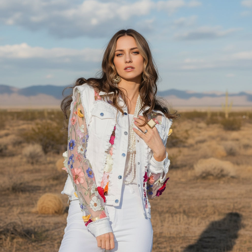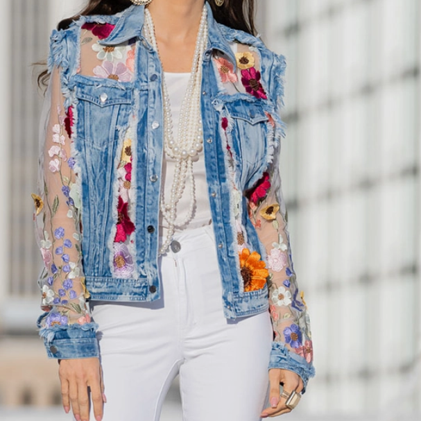 The Simply Beautiful Jacket lives up to its name. This standout denim jacket features sheer mesh sleeves adorned with intricate floral embroidery, blending soft femininity with classic denim structure. Rich pops of color and delicate stitched details create a look that feels romantic, bold, and effortlessly eye-catching.