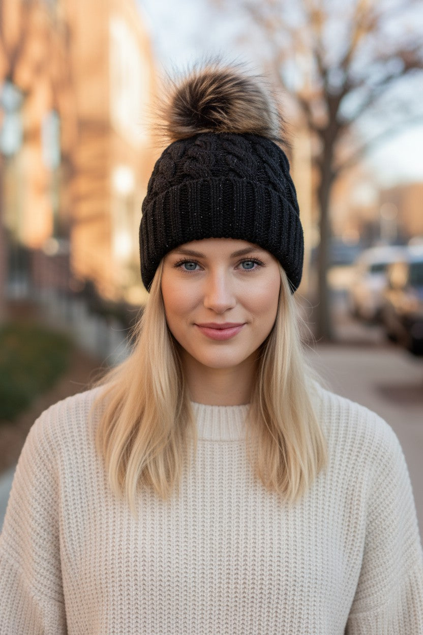 Black Pom Cable Knit Beanie