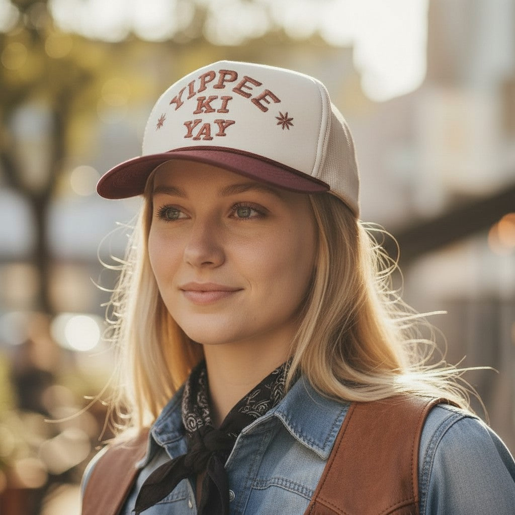 Kick up some dust in this Western-inspired “Yippee Ki Yay” cap. Featuring bold raised embroidery on a crisp cream front with a contrasting deep-burgundy bill, this hat brings classic cowboy attitude to any outfit. The structured shape keeps it looking sharp, while the adjustable back ensures a perfect fit for everyday wear.