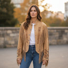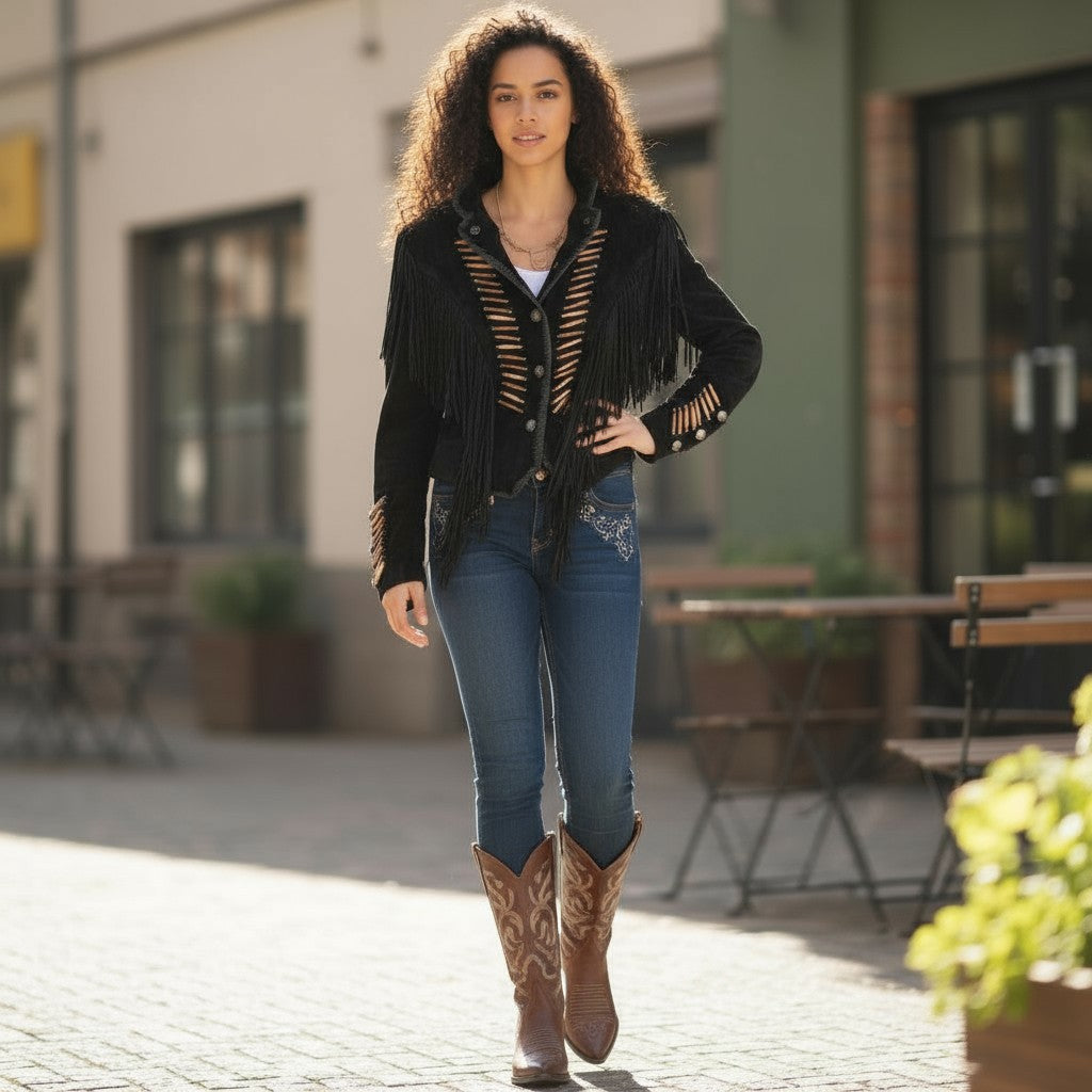 Decorative bone bead lacing runs down the front and sleeves, adding authentic rustic detail, while silver concho buttons enhance the jacket’s vintage-inspired Western appeal. Tailored seams and a cropped cut flatter the silhouette, offering a structured yet feminine fit. Finished with a soft inner lining, this jacket delivers all-day comfort without sacrificing style.