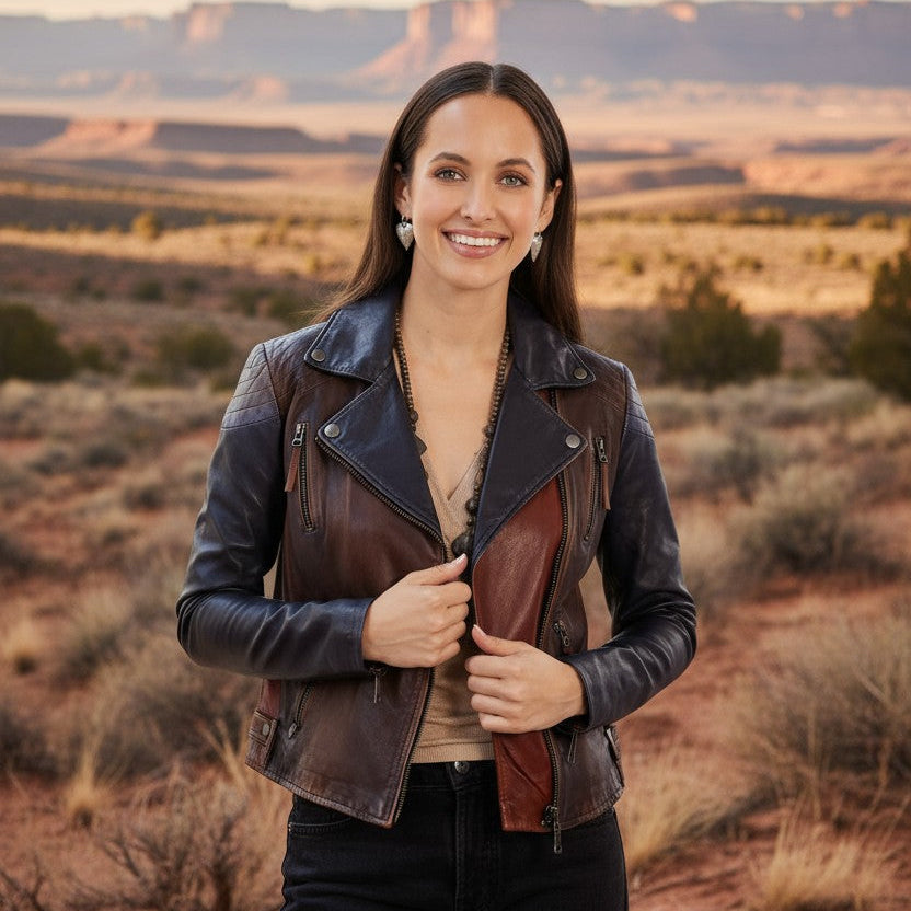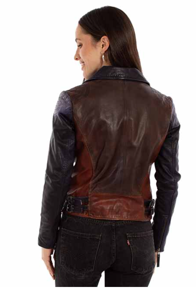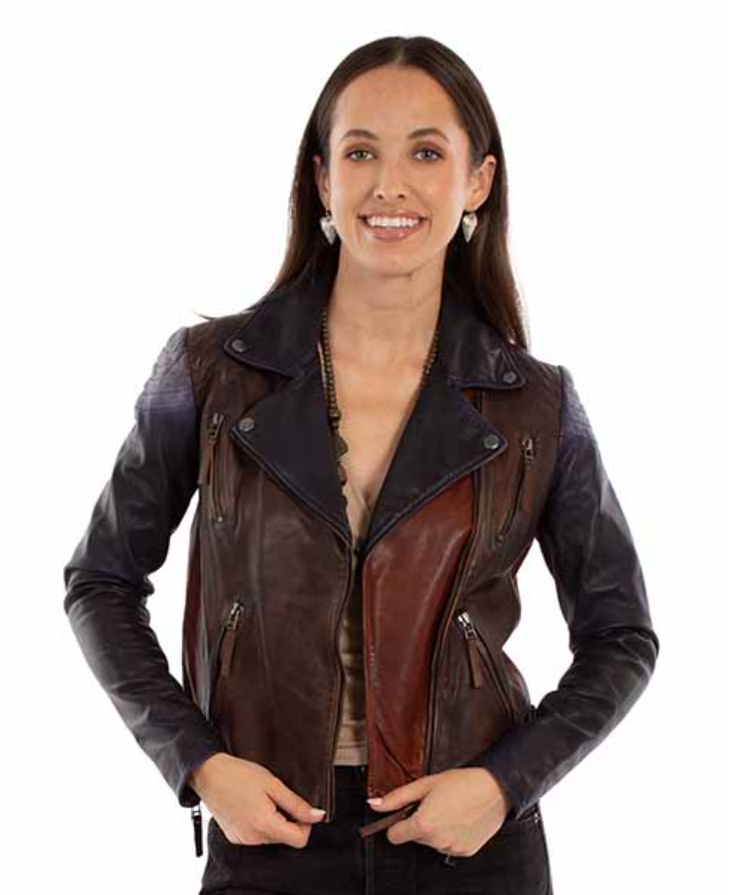 The Scully Vintage Moto Jacket is a bold, fashion-forward take on a classic biker silhouette. Crafted from premium lambskin leather, this color block moto jacket features rich, contrasting shades of chocolate, cognac, and black for a striking, vintage-inspired look that stands out while remaining timeless.