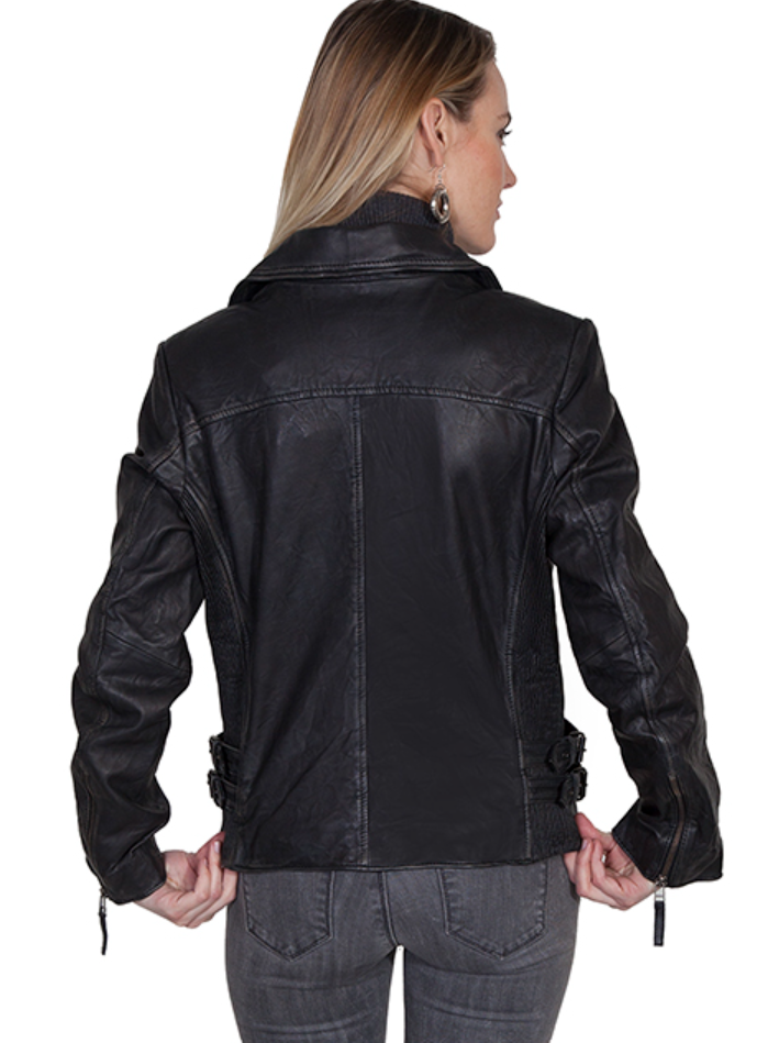 * Asymmetrical zip front with buckle closure