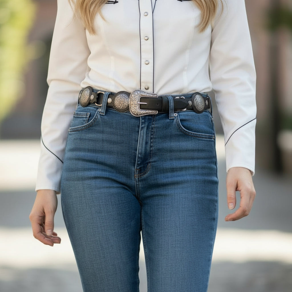 Add an effortless western accent to any outfit with the Aly Belt, a slim black concho belt designed for everyday styling. Featuring polished silver conchos with turquoise stone centers and an engraved western buckle, this belt blends classic cowgirl charm with a modern, wearable silhouette.